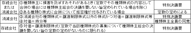 上記以外でも、吸収合併消滅会社等で種類株式が発行されている場合、吸収合併等によって特定の種類株式を有する種類株主に損害を及ぼすおそれがあるときは、その種類株式を有する種類株主によって構成される種類株主総会により承認を受けることが必要となります(322条1項)。この場合は、種類株主総会の特別決議事項となります(324条2項4号)。これは、譲渡制限株式等が割り当てられるかどうかにかかわらず、特定の種類株主に対して損害を及ぼすおそれのある場合一般についての規制です。