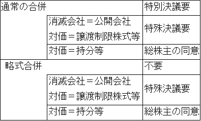 吸収合併等は、会社の基本構造に重大な影響を与えるため、消滅会社等において、原則として株主総会の特別決議による承認が必要とされています(783条1項)。譲渡性の低い対価を交付される場合、株主の権利保護のため、株主総会の決議要件が加重され、総株主の同意が求められる場合もあります(783条3項)。これらの場合には、略式合併はできません。さらに、種類株式発行会社は、譲渡性の低い対価を交付される種類株主の利益を誇ずるため、種類株主総会の承認ないし総株主の同意が要求されます(783条3、4項)。