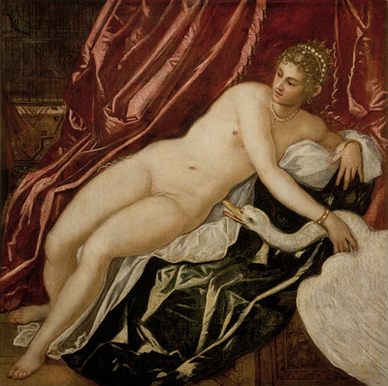 続いて、ティントレットの「レダと白鳥」(右図)が展示されていました。同じ裸婦ですが、「ダナエ」と並べると雑な感じで、裸婦には生気が感じられないし、白鳥はお座なりにしか見えないし、ガッカリの作品でした。