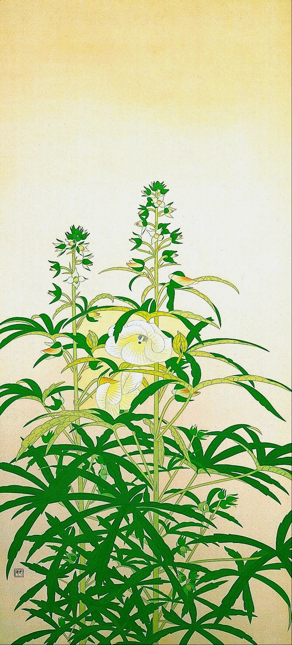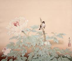 土田麦僊「黄蜀葵」は1932年の作品。日本画って人物画はマンガと同じで人間の肉体をリアルに描くというのではなく、美人とかヒーローのお約束の記号的シンボルの文法に従って描くのに、植物などは写生的な描き方をするのが不思議です。この作品では、そこにデザイン的な操作が入ってくる。葉の明るい緑色が鮮やかで、それら花の白が対照されています。画面の下半分は、細長い葉がパアーッと広がっていて鮮やかな緑が占めていて、画面の上の方では、草が伸びて若芽や葉は、未だ色が付いていなくて緑色は薄くて、その先に白い花が咲いている。そういうグラデーションの推移が緑色を印象深くしている。 同じ緑色の鮮やかさでも、榊原紫峰の「富貴草」は1938年の作品。牡丹の花は、一応写実なんでしょうが、花鳥画の王道というか、歌舞伎の見得を切るようなお決まりのパターンに見えます。装飾的といえばいいのでしようか。その傍ら、画面右の支柱に雀が止まって囀っている。装飾的でゴージャスな牡丹と無邪気で素朴な雀が対比的に置かれているといった画面構成です。これは、ちょっとあざとい感じもします。この人、几帳面にきっちりと描き切るので、作為が隠すことなくあからさまになるとこがあると思う。この作品の雀なんて、無邪気というよりブリッコだもんね。
