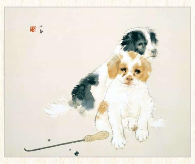 そして、竹内栖鳳です。“東の大観、西の栖鳳”です。よくまあ、集めたものだ。「爐邊」という1935年の作品。これって秋を感じさせるのでしょう。細かいことは考えない方がいいのでしょうね。爐邊というタイトルと手前の火かき棒から暖炉か囲炉裏にあたっている2匹の子犬です。竹内栖鳳というと猫が有名ですが、犬も描いているのですね。サラサラって手すさびみたいに軽く描いているようですが、上手いとしか言いようがありません。