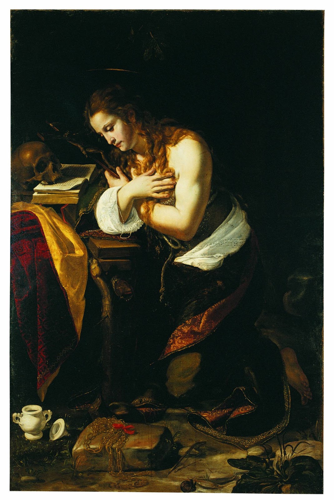 今回は、同じ題材を他の画家が手がけた作品が並んで展示されていたのと、比べて見たことにより、カラヴァッジョの作品の特徴が改めて見えてきましたので、その点を中心に述べていきたいと思います。ジョヴァンニ・フランチェスコ・グエリエーリの「悔悛のマグダラのマリア」(右上図)と見比べてみましょう。カラヴァッジョの特徴として光と影のドラマということを散々述べてきましたが、光と影の対比が映えているという点で見れば、カラヴァッジョの「法悦のマクダラのマリア」よりも、むしろこちらのグエリエーリの「悔悛のマグダラのマリア」の方が目立ちます。画面左下から、つまり、俯くマグダラのマリアに向けて正面から光が当てられ、暗闇の中で、マリアの顔を中心とした正面が光り輝く、と描かれています。神々しさでは、カラヴァッジョの作品より、こちらの作品の方が印象が強いと思います。マリアの描き方についても、艶やか肌に豊かな金髪が流れるようで、そこに光が当たり光っています。顔の彫りは深く、ギリシャ彫刻の女神像のようです。そして、腕を交差して祈るように俯いているさまは、天使か聖人といった輝かさがあります。作者のグエリエーリはカラヴァッジョの手法を活用して輝かしい効果を生んでいると言えると思います。