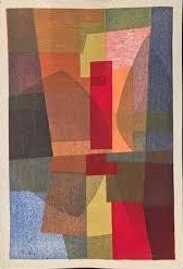 同じ年の「Autumn」は木版の重ね摺りによる作品です。この作品の真ん中あたりの赤い縦長の長方形を見て下さい。赤のインクが半透明になっていて、下に摺られている黄色の長方形だったり、オレンジの葉の形だったりの重なった部分が透けて見えています。しかも、半透明なので、赤いインクのフィルターを通したように色が変わっています。これは油絵では、絵の具が重なると色が上書きされるように下の層の色は見えなくなってしまい、塗られた絵の具の層が厚くなって、重量感が生じるのですが、このような半透明の効果は現われません。また水彩画ならば、水彩絵の具が溶けて混ざってしまいます。ここでは、重層的な質感でも、水彩の融合しあうような感じでもなく、平面の重なりが、その平面のすべてを見ることができます。そのためでしょうが、平面が重なっているのに、対立するような緊張感も重量感もないのです。ここには平穏でしかも軽みが感じられます。この軽みと静かな画面に、この人の一つの側面が表われてきていると思います。
