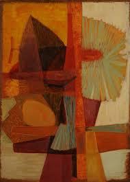 「Autumn」は1956年の油絵作品です。しばらく版画を制作していて、また油絵ら戻ってきたということでしょうか。版画での経験を、油絵の制作に用いたということでしょうか。前のところで、同じ「Autumn」という題名の1954年の版画を見ました。まるで、その版画を油絵にしたようにも見えます。版画では、半透明のインクによって重なった平面が透けて見えることにより、静けさと軽みを感じさせる画面になっています。この透けて見えるというのを油絵でもやろうとしたのが、この作品です。そのために、絵の具を薄めてみたり、一旦塗り重ねた絵の具を削り取ったりを試みているようです。とはいうものの、版画作品の軽みは油絵では難しいようです。油絵の方では版画に比べて絵の具の物質感がでて、重い感じがしてしまう。この後には、油絵作品の展示がなくなってしまうのですが、彼女は、油絵に限界を感じ、あまり描かなくなっていったからでしょうか。この作品を見ていると、そんな気がします。