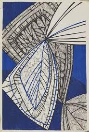 「Butterfly B」は1953年制作の木版画。蝶は雨(「Butterfly B」と並んで「Rain B」という1953年の木版画もそうです)とともに、このあと、彼女が、たびたび用いることになる題材です。この作品では蝶の全身ではなく、翅のみをピックアップして、それもアゲハチョウのような翅の模様ではなく、翅脈を強調するように黒い線を引いてはっきりさせて、それを模様のように見せています。バックの地の部分を暗い青とそうでない青の二つの部分に色分けして、落ち着いた雰囲気ができているところに、黒い線による蝶の翅を図案化したようなものがある。彼女の雨を題材にした作品では、黒い線が画面に動きを生み出していたのに対して、こちらは翅が一枚では何枚もあることから反復とか積み重ねというような動きを生み出しています。