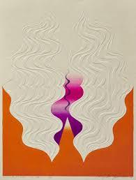 変わってしまいました。「うちなるもの」にあった、インクが垂れたり、迸ったりするダイナミックさは影を潜め、全体としてすっきりと整理され、洗練された雰囲気が強くなっています。1967年に、吉田穂高とともに自宅兼アトリエを三鷹に新築し、落ち着いた環境で制作に専念するようになったそうです。このあたりが転機どなっているのでしょうか。エンボスを用いて、紙にレリーフのような凹凸をつけて、画面に変化を与えています。この作品では、レリーフは波型の層を成すように施されていて、静かな画面に動きを生んでいます。しかし、レリーフによる凹凸は白い紙であることに変わりはないので、見る角度によっては分からなくなるので、線を引くことに比べると密やかな感じがします。それが、動きがあるにもかかわらず、全体的に静謐な雰囲気になっています。この作品では、波型のレリーフは左右対称っぽく配置され、画面下部は赤く着色されていますが、着色はムラがなくスッキリしています。絵画とか版画というよりはイラストに近いような印象です。