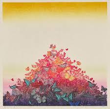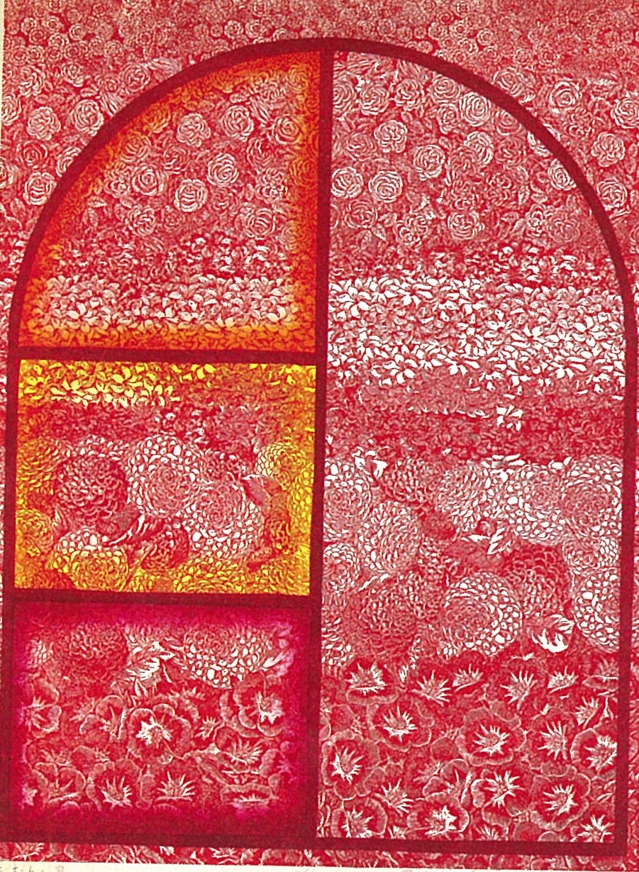 「蝶たち 集う」は初期の版画でたびたび題材にしていた蝶を写真製版で用いた作品です。よく見ると、同じ図を、色を変えたり、反転させたり、向きを変えたりして何度も使いまわしているようです。幻想的な作品と言えますが。それは感性として幻想的であって、内面を反映した心象世界ではなく、あるいは何かをシンボライズしたような意味をもつものではないと思います。この人の抽象的な作品もそうでしたが、何かの本質とか世界とかを表現するというのでも、抽象表現主義のように見えない何かを表現するというのではない、彼女はただキレイなものを描きたい、何がキレイなのかと、さまざまな方向を探しているなかで、抽象的な作品で表現されたキレイさに惹かれて、私もやってみようとして試したというように思えます。この作品の幻想的というのは、それがキレイだからというもので、そういう点で、彼女の作品は一貫していると思います。