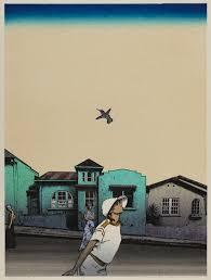 ここからは、しばらくの間、版画の展示が続きます。1953年の「天龍寺庭園」は、彼女がはじめて制作した版画のひとつだそうです。結婚相手である吉田穂高と共同というのか教えを受けながら制作したという作品だそうです。実際の天龍寺の画像と比べると分かるのですが、前景が枯山水の砂で、中景が池、後景が植栽、そして背景の空を4つの色面として画面を作っている。ここには、奥行きのパースペクティブや陰影は失せて、二次元の平面になっている。これは、油絵での2番目の「無題」でやったことを、そのまま版画の画面作りにしていると思います。むしろ、対象の形の輪郭を取り出して、形を単純化する。すると図形のようになっていく。そして単純化した図形のような平面の組み合わせで画面がつくられる。それを油絵の「無題」をはじめとした作品でやろうとしたことが、版画では、もっとやりやすいというか、向いている。つまり、木版画の版木を削る手間を考えると形態を単純化する方向となり、それぞれの色の版木をつくり色ごとに摺らなければならないので、画面の単純化の方向に志向することになると思われるからです。この後の展示を見ていくと、版画を制作することなることになって、この人の描き方の方向性は進んだのではないかと思えるところがあります。