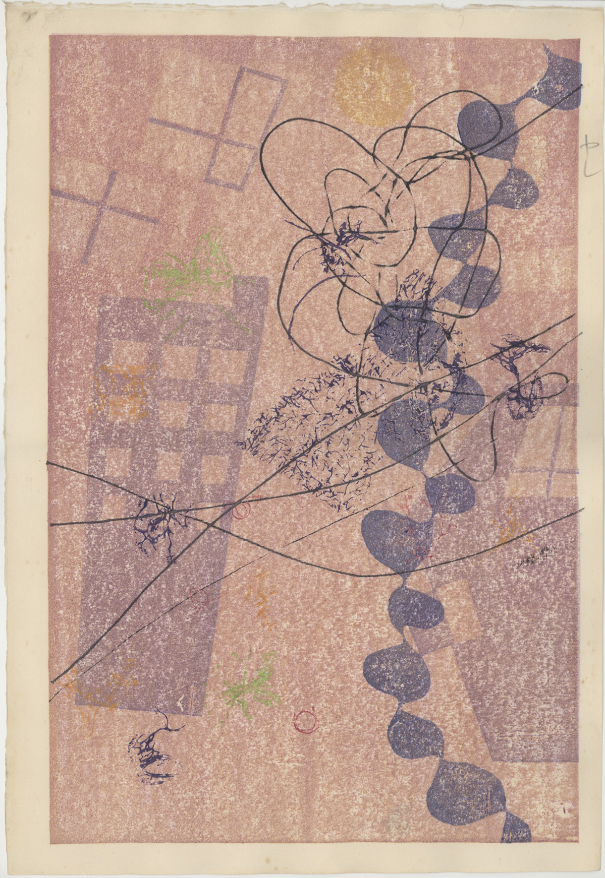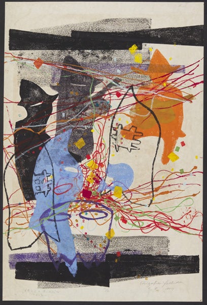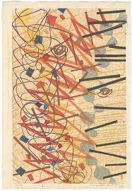 同じ年の「Mambo」というモノタイプの作品です。版板に直接絵を描いたというより、マルチブロックのようなある物にインクを塗って直接紙に、スタンプのように用いて、即興的に押して、それで作品が作られているように見えます。それは、制作するというプロセスをパフォーマンスとして、作品は、その結果ということになります。それは音楽、とくに奏者の即興を重視するJazzやMamboといった題名に