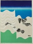 「礁A」は1973年の作品。画面むかって左の半面に波型のレリーフが施され、この波型は海を連想させるということで、様々な貝がパーツのように散りばめられています。これまで物を単純化した形態や抽象化した図形をパーツとしてもちいていたのが、ここでは具象的なものを用いるように変わってきました。レリーフの波型や画面上下端の青や緑の着色はイラスト的で、そこに具象的な貝が散りばめられているは、お洒落な商業的ポスターといった印象です。この雰囲気は初期の抽象的な作品を制作し始めたころには感じられましたが、その後、彼女が新しいことを試していくときには後退していたのが、そういう表現上の挑戦をひととおり経て、落ち着いてきたところで、もともと彼女が持っていた、お洒落とか可愛らしい感性が少しずつ表に出てきたように感じられます。
