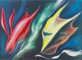 「メキシコのカーニバル(ハマシロにて)」は1957年のモノタイプ作品です。これなど、アクション・ペインティングだといってもいいのではないか。赤や緑の細い線が絡まり合っているのは、ドリッピングに見えます。ただし、この作品は、穏やかな印象で、画面全体に静けさが溢れている。それが彼女の特徴ではないかと思います。