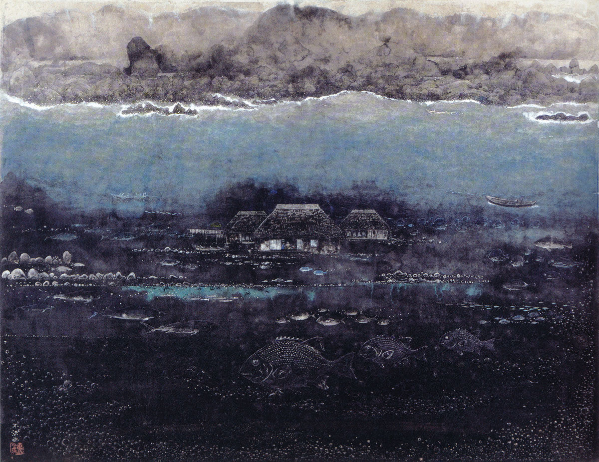 その作品も、一風変わっています。富士山や海といった、日本画としてはありふれた画題を描きながら、不染ならでは画力と何ものにもとらわれない精神によって表現された作品は、他のどの画家の絵とも異なり、鳥瞰図と細密画の要素をあわせ持った独創的な世界を作りあげています。