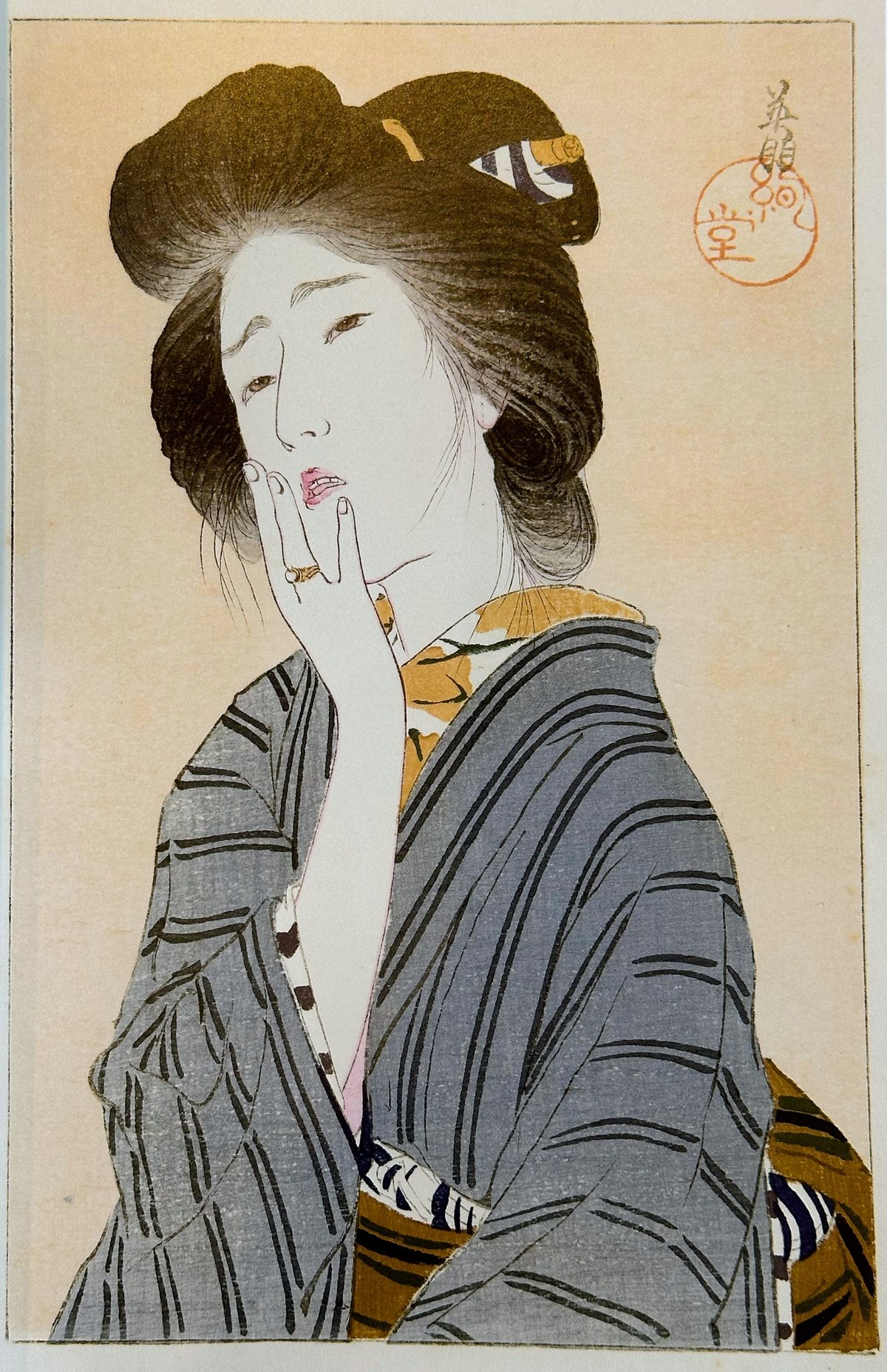 私は鰭崎英朋という人のことを知らないので、その紹介がてら、主催者のあいさつを引用します。 “鰭崎英朋(1880〜1968)は明治後期から昭和にかけて活躍した絵師である。浮世絵師・月岡芳年の門人である右田年英に入門し、明治36年(1903年)頃から文芸雑誌や小説の単行本の口絵の制作を本格的に始める。明治末から大正にかけて、文学界を彩った英朋の妖艶な美人画は、広く大衆の心をつかんで大いに話題となった。他の絵師たちが展覧会に出品するために日本画の制作に傾注するなか、英朋は生涯、雑誌や小説という大衆向けのメディアを拠点とする絵師として活躍するのである。 英朋が手掛けた口絵や挿絵は、歴史の終わりを迎えようとする浮世絵版画(木版画)と、徐々に技術が進歩していく石版画やオフセット印刷によって制作されている。英朋は、浮世絵と石版画という、二つの異なる大衆向けメディアに専心した稀有な絵師であり、浮世絵版画の終焉を看取ったという意味で、真の「最後の浮世絵師」と言えるだろう。 本展覧会は、英朋が手掛けた木版画や石版画、オフセット印刷による口絵や挿絵、さらには肉筆画や下絵を含めた187点の作品を通じて、出版メディアが移り変わる時代の狭間に活躍した英朋の画業を紹介する。”