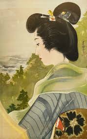 「避暑地にて」(左側)『婦人画報』第137号口絵です。これはオフセット印刷によるものです。オフセット印刷は、平らな版(刷版)を使用して印刷を行う平版印刷の一種です。版にインクをつけ、それをブランケットと呼ばれるゴム製のローラーに転写し、さらにそのローラーで用紙にインクを転写することで印刷を行います。この「版から一度離して(オフ)、転写する(セット)」という工程がオフセット印刷の名前の由来です。カラー印刷は、シアン・マゼンタ・イエロー・ブラック各色の版を出力し、それぞれ印刷を行う。印刷機の中に紙を通し、一枚の紙に4つの色を刷り重ねていくことで最終的な仕上がり色を再現します。オフセット印刷の基本的な画面の作りかたは印象派絵画の点描に近い、今でいえば、ドット式のプリンターのような作りかたです。そうなると、線描を基本とする浮世絵も日本画も、線を活かせないので相性がよくありません。これには西洋画の色を塗った面で構成される絵画が相性がいい。そこで、鰭崎は浮世絵というよりは水彩画のような作品にしています。それででしょうか、今までにない軽い画風になっています。朦朧体とは言いません…。 第3章 肉筆画