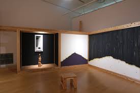 ロビーを隔てて向かいの展示室に移ります。展示室に入ると左手に、仕切が設けられ、その内側は床の間や窓が設けられた民家風にしつらえてありました。展示室を右手に行った奥には、インスタレーションが置かれていました。