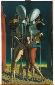 「小道具の静物」(左側)は1924年の作品ですが、直前まで見てきた抽象的な表現から、この作品では具象的な作品になりました。同じ壁面にキリコの「ヘクトールとアンドロマケーの別れ」(中央)が並んで展示されていて、まるで影響関係があるかのように見えます。ヘクトールは古代ギリシャのトロイの木馬で有名にトロイの王子で英雄アキレウスとの一騎打ちで敗れて死んでしまうのですが、その戦闘に向かうヘクトールを妻アンドロマケーが見送る別れの場面なんでしょうが、抱擁する二人の邪魔をするかのように二人の周囲には建設の足場のようなものがまとわりついています。しかも、抱擁する二人はマネキン人形になって、その肉体性が冷たい金属に置き換えられています。これは見ようによっては、クレーの「淑女の私室でのひとこま」のエログロをはぐらして、あるようでないような不思議なものとなっています。くれーの作品では、画面の”中央にも、マネキンあるいは人形の姿を認めることができる。舞台の小道具としてのそれは、花瓶、水差し、打楽器、マレット、楽譜、旗やそのほかの得体のしれない道具たちと一緒に、その腕を外されて雑然と倉庫に収められている。舞台を降りた道具たちは、人知れず静かに生命を帯び始める。円や四角といった自然の原型となる形を内部に秘めながら、自ら光を発して眼を開こうしている。(図録P.153)”つまり、これは抽象画からの具象画ともいえる。抽象的な本質的な形が抜き出されて、それがあえて具体的な事物に宿る過程が描かれている、ということができる。キリコが夢か現実かといった不思議な世界を創り出したのに対して、クレーは抽象と具象を裏返してみせたといえるのかもしれません。1925年の「舞台稽古」(右側)という作品では、線で描かれたものと彩色が全然別でかみ合っていなくて、それが却って、事物の具象性と抽象性を曖昧にしてしまって、幻想的な具象画とも抽象画ともいえない不思議な作品になっていると思います。