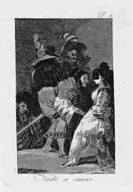 展示室に入って最初に目に入るのは、「喜劇役者」というエッチング作品。クレーがおおやけに発表した最初の作品である『インヴェンション』という版画集のうちのひとつです。クレーはミュンヘンの美術アカデミーになじめず、退学してしまい、当時のハイカルチャーにたいする大衆的な『ユーゲント』という雑誌に風刺画を寄稿したりしていた経験を生かして、1906年のウィーン分離派展に出品したということです。”エッチングはあくまでも一時的な方向転換であり、本来自分は絵画を本業とすべきだとクレーは考えていた。彼がエッチングに集中的に取り組んだのは、生涯においてこの時期だけであったし、レリーフのような陰影を伴うグロテスクに身体表現もほかに類を見ない。それゆえ『インヴェンション』は、あくまで画業の初期段階における試行錯誤のひとつで、それ以上進むことを諦めた道のひとつであった、とみなすこともできるかもしれない。しかし、その一方で、『インヴェンション』を主題の面から特徴づけている、生の根源的な悲劇性を皮肉によって表現する風刺的な態度は、クレーの生涯にわたる創作活動に認められるのである。(図録P.21〜23)”と説明されていることから、この章の「詩と絵画」というタイトルのとおり、クレーにははじめのころから文学的な嗜好があったのが、この作品からも見られるということでしょうか。中でも、この「喜劇役者」古代ギリシャのアリストファネスの喜劇「雲」を念頭に置いていると説明されていました。”クレーが「喜劇役者」で主題としたのは、「グロテスクな仮面」とその下にある「苦悩に満ちた真剣な表情」の対比であり、アリストファネスの喜劇が誘う笑いと、その笑いを通じて明らかとなる世界の嘆くべき真実との対比である。(図録P.25)”。そして同じ壁面には、並んでゴヤの銅版画(右側)が、参考でしょ