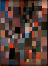 1923年から、クレーは画面をゆるやかなグリッド構造に分節して、さまざまな色彩を布置してゆく「方形画」と呼ばれる作品の制作を開始する。それらは多くの場合、暗い下地のうえに油彩などの不透明な絵の具によって描かれた。クレーは補色を含むあらゆる色彩の関係を、運動という連続性のなかで捉えようとした。この作品に現れる多様な色彩もまた、白と黒を両極とする色彩立体における連続的な運動のなかで捉えられる。たしかに、例えば画面の中央にある薄ピンクと、隣接する濃紺とのあいだには飛躍が生じている。しかし、より視野を広げてみれば、この飛躍的な関係は、色彩立体において近接する色彩や中心点としての灰色を経由して、連続的な運動を獲得するのである。”という展覧会場でのキャプションでの説明です。クレーの絵画が音楽的であるとわれるのは、このタイプの作品で、長方形という単純な幾何学的な形態を使いながら、色彩の組み合わせによって、深みや奥行き、リズムを生み出し、色彩のハーモニーによって、音楽的な響きを表現しようとしていると考えたのだと思います。