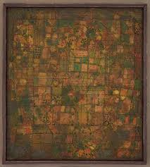 「小さな家」は1928年の作品です。「赤、黄、青、白、黒の長方形によるハーモニー」のような方形画の上に、有機的生命的とでも言えるようなものが乗っている。グリッドをつくるのは黒い線で、画面上に油絵具を盛り上げるようにしておかれた線は、フリーハンドで、壁を蔦がはうように見えます。そして、グリッド仕切られた画面は、そのグリッドのとおりに色分けされているのではなく、時にグリッドに従い、時に無視するように、大地を連想させる茶色をベースに、植物を連想させる緑や花を連想させる赤などを散りばめながら配されています。