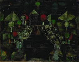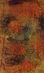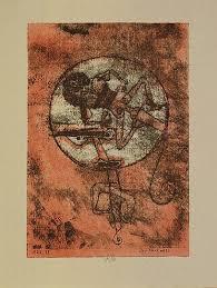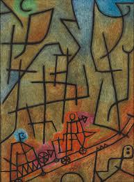「淑女の私室でのひとこま」は1922年の作ですが、画面中央の水平に描かれている唇のようなものは、女性性器を横に描いたもの。いわゆるオ×ンコで、それに両端に車輪をつけた奇妙な機械や首を長くしたアンテナのような機械、植物の雌しべをつけたような機械が絡んでいる。これってエロで、機械をくっつけた猟奇的グロでは・・・。この作品を見たときに、笑っちゃいました。クレーは、こんな作品を描く・・・。もしかしたら、ダダの影響なのでしょうか。