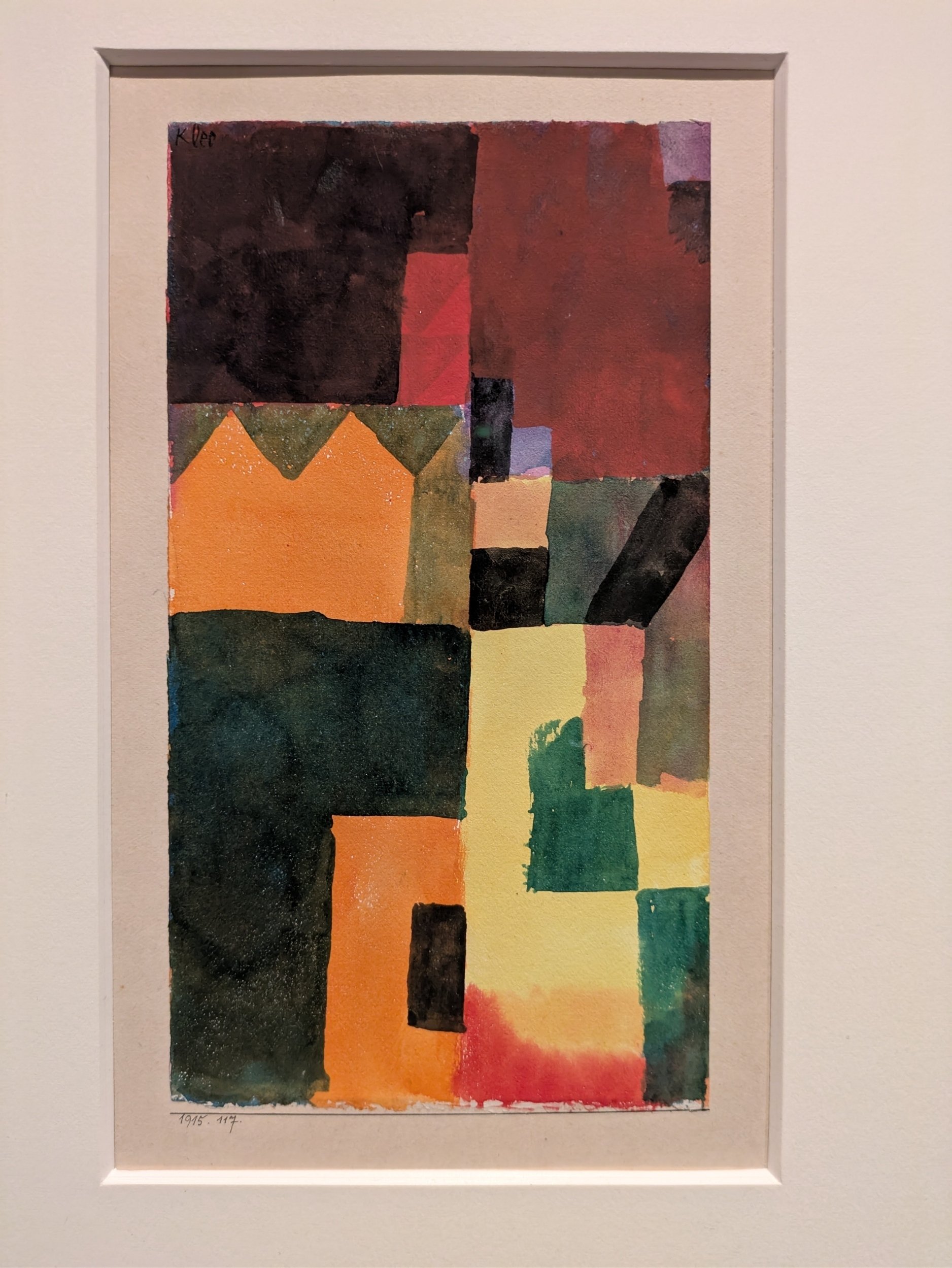 展示室は一つの大きなフロアをパーティションで区切って、各コーナーの入口に大きな幟を垂らして知らせるようになっていました。ここでは、カンディンスキーとの出会いや、パリで興ったキュビスムの影響が見られる作品群が、ピカソをはじめとする当時の周縁のアーティストらの作品とともに紹介され、また、1914年にクレーは青騎士展に参加していたアウグスト・マッケや旧友のモワイエとともにチュニジアに滞在。そこで、3人で刺激を与えあいながらも、色彩表現の試行錯誤やキュビスムの応用、そしてチュニジアで目にした鮮やかな色彩を受けてさらなる制作活動に励んでいった。