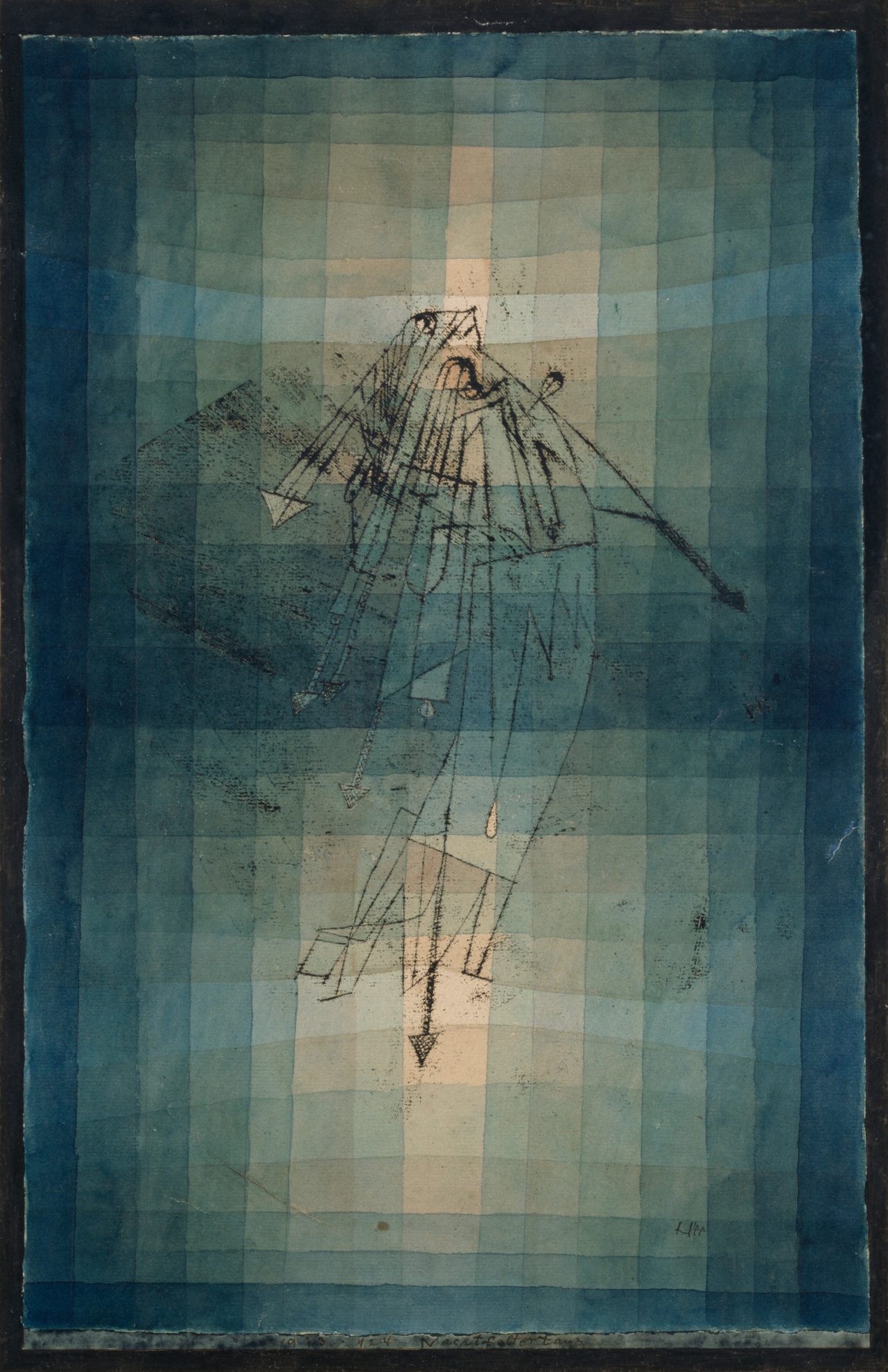 1923年の「蛾の踊り」という作品です。いろいろな説明が加えられているようですが、この青が何よりも魅力的で、少し前に見たミロの明るく澄んだ青とは異なる、深海の底のような暗く沈んだ青は、クレーという画家のイメージそのものです。引き込まれそうな青です。画面は、格子状になっている青色の階調を照らす黄色い光の中、蛾が羽ばたいています。背景の青のグリッドについて”水平方向を軸とする移行は、おおむね均等に分節された階層を暗、明、暗という順序で進むが、垂直方向を軸とする移行は、暗、明、暗、明、暗という繰り返しを伴っているだけでなく、各段階を分節する水平線が、ふたつの明の中心あるいは画面の中心へ向かってゆるやかに湾曲している。加えて、本来なら最も明るい青色で塗られるべき領域が、黄色味を帯びた色で塗られることで、支持体の白を残した段階と「蛾」の身体の一部を除いて、画面はやや緑がかかった青色へと変化している。これによって、明暗の運動が生み出す力は、ふたつの最も明るい点を結節点としながら、女性に擬人化された蛾へと集中していく。(図録P.237)”このグリッドと蛾とは一体化していなくて、それぞれに個別だが、かといって無関係というわけでもない。黒い線で描かれた蛾は油彩転写素描という技法で、それは、手の圧力のかけぐあいによって転写される描線に効果を与えるというもので、なぞる力の強弱や動きの緩急に応じて、原画の端正な線はほぐれ、表情豊かな線が画面に転写される。線の他にも、手を置いた場所には当然その跡が残るという効果があります。ここでも、油彩転写によって線描を転写する際の油絵具のかすれが、線の輪郭を超えて背景の方へと広がっていて、とりわけ弓形になった身体の背中側に強く現れるかすれは、線描を色彩の側へと霧散させているように見えます。他方、背景の側からは、中央の線描と無関係に広がっている色彩のグラデーションに見えますが、その明度のピークが画面中央部の上下の二箇所に存在していて、その上側の最も明度の高いブロックは弓形になった身体のエッジに位置する顔とピンポイントで重なっていて、また下方の明るいブロックは足元のあたりと一致しています。弓形の身体の顔と足という両極に明度のピークが重なり、その二つの間を格子状のグラデーションが、なだらかに繋いでいることが分かります。二つのレイヤーに切り分けられた線描と色彩は、相互に歩み寄りを見せているというわけです。それだけではなく、ここで、右側の足の短い直線に沿う仕方で、色彩のグリッドが歪んでいます。色彩のリズムは、そっと触れた指によって表面張力で盛り上がる水面のように、線に触れることによって干渉を受けているのです。あたかも線と色彩が接触しながら、色彩の波紋に密かな乱れが生じているかのようなのです。この線と色彩の接触は、生と死を分かつ危機的な境界線上でこそ起きている。それはまぎれもなく胸に刺さった矢の位置です。この矢は線と色彩の接触地点となっていないようだ。しかし胸の矢から複数の線を辿りながら視線を降ろした先に、その危機的な場所はある。2本の直線が交