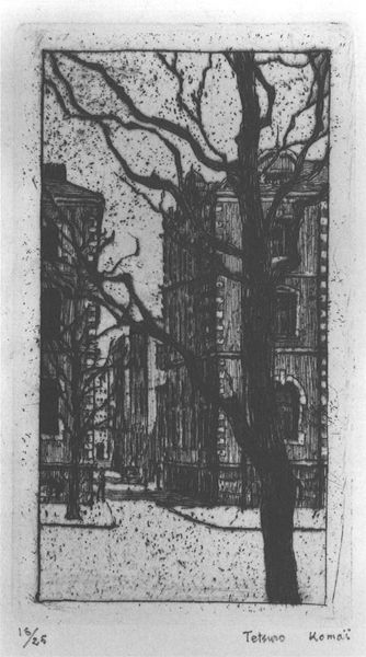 「樹木」(右図)という作品では、ぼんやりした画面での黒の諧調とは正反対の無数の細い明確な線が縦に走っているという画面で、白か黒かという、以前の黒と白の中間を彷徨っていたのが、黒と白の二項対立になってしまった刺々しさのあるような作品です。樹木という対象を描写した具象作品に見えるのですが、引用した大岡信が書いているように、描くというよりは線を引くという作業を繰り返しているような、その際に樹木という名目で行ったというような印象です。これは、個人的な想像ですが、そうやって線を引く、それを銅版の上で試みようとしたのが「エチュード」(左下図)という作品であるように思います。版画のことはよく分からないので、説明では“筆の勢いをそのまま表現できるリフトグランド・エッチングの技法を使い、にじみやかすれといった筆の跡が荒々しく画面に留められています。”画面の上下、つまり縦に線を引いていった結果、このような作品になった。「樹木」から対象である樹木を取り払った残りが、この作品ではないかと思われます。