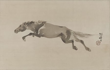 まず、展示室に入って最初に目についたのが「奔馬図」(右図)という小品です。京都四条派の得意の技法とのことですが、輪郭線を用いずに濃さの異なる墨を使い分けて一気に形を筆で描いてしまうのだそうです。一気に筆を奔らせることで墨痕や筆跡をうまく活かして、馬の走る躍動感が表われているようです。省略されているのですが、脚部の筋肉の動きや、その織りなす陰影を想像させてしまうのです。かといって、蹄とかたてがみ、顔では鼻や口の様子などは、細かく形が捉えられて、省略といっても、細かく描かれているように見えてしまう。それは、形状が恰も正確であるかのように見えてしまうからでしょう。顔の部分は影になっているのか、目を見開いているように見えてしまう。これだけ、形状を一気呵成に筆で引いて、説得力あるものにしているのは、よほどのデッサン力があるのではないかと思います。じじつ、スケッチ帳の一部が展示されていましたが、そのスケッチの上手さは完成した作品をみているより面白いものでした。そして、私の個人的な偏見かもしれませんが、近代日本画で輪郭線とリアルな写生とがうまく織りあわないで、線が画面の中で浮いてしまって、うるさく見えてしまうことが、回避されているのです。だって、輪郭線がないわけですから。これは、木島のデッサン力あってこそのものだと思います。ここに私は、木島の特徴を次の2点に見ます。一つは抜群の形状の把握とそれを描く力です。それが、かれの描く作品がリアルな写生に見えてしまうことに通じます。これは善悪の両方の面があると思います。もう一つは、近代主義的、あるいは西欧絵画的な空間把握の性格です。空間を点と線ではなくて、平面と立体として見る視点です。だから、木島は描くときに、線を前提としていないように見えます。多分、描く対象を見る時に輪郭線を意識していないのではないか、ということです。これらは、私が考えている近代日本画の一般的特徴とは反対の指向です。その矛盾が、後の作品で観るように木島の独自性を作り上げていくように、私には思えます。