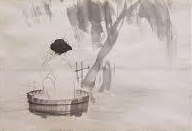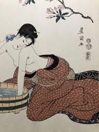 「行水美人図」(左側)は細密な眼鏡絵に比べて大雑把というか、走り書きのスケッチようにも見えます。しかし、行水する女性の後ろ姿のプロポーションは、あとで見る人物画などより写実的で、背景の木や垣根の位置関係には、しっかりとして奥行の空間把握がされています。それは、浮世絵の行水図などと比べると、さらに明白です。例えば、歌川豊国の「えり洗い」(右側)の人体描写の歪みと比べると、それは明らかです。これらを見る限り、応挙の作品は、江戸情緒などというものとは無縁で即物的な印象です。ただ、日本画の筆と絵の具と和紙しか手元にないので、それを用いた表現をしているだけという印象です。