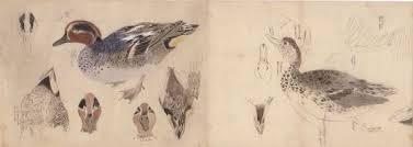 「鳥類真写絵巻」(左図)「写生帖」(右図)。これはすごい。見ているだけで圧倒されます。私は、これが今回の目玉ではないかと思います。画像だと、その精緻さが分からないのですが、実物を観ると、こんなところまで観察して、それを描いているのかと感心してしまいます。鳥の羽毛の1本1本まで細密に描き込まれています。この描写力はすごい。鳥が羽を閉じている姿はもちろん、広げた羽も別途に描かれていて、まるで鳥類図鑑を見ているかのようです。西洋絵画であれば、骨格などを学んで、理論的にその形を捉えるベースができているのですが、応挙は骨格など学んでいないだろうから、単に見ているだけで、これだけの描写ができてしまっている。それがすごい。これは、いつまで見ても、見飽きない。言葉がない。