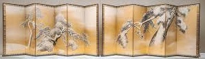 「雪松図屏風」。“雪と松を描いた本作は、墨・紙・金泥と砂子という最低限の素材しか用いられていない。画中の雪は絵の具ではなく、塗り残した紙の白さによって表わされているのである。それにもかかわらず、観者の目の前には確かに、降り続いた雪がやみ、きらきらと輝く情景が広がっている。この「実在感」はどのような技法によって裏付けられているのか。例えば右隻の幹の立体感は、大きい筆を面的に用いて表している。近接して観察すると、濃淡の異なる墨線が短いストロークで複雑に重ねられることで、ゴツゴツした樹皮の質感と、樹木そのものの立体感が同時に表現されていることが分かる。対して左隻では、淡墨を引いた上から、松葉のU字型の線を執拗なまでに描き込み、遠目から見た樹皮の凹凸を的確に表す。また針葉樹の表現は、まず全体のシルエットを白く塗り残した上から、松葉の束となる形に淡墨を引く。その上から濃墨で扇形に広がる松葉を少しずつ密度を変えながら描いている。松葉の塊を上から、両方のアングルから見た形を、量感もって表す点が見どころと言えよう。(図録P.110)”と説明されています。普通は、このような絵は、金色の地を作って、そこに松を描いて、その上に雪が積もったように白を描き加えるというように重ねていくと思うのですが、この作品は白い紙の上に松の形で白い紙の地を残すように金泥を塗って、残った白地のところに松の雪のついていない部分を黒で描き加えている、というのです。それは、画面をよく見ると分かります。つまり、雪は描き重ねて加えられるのではなく、もともと雪の白があったところに他の金地や松によって削られた残りだったというわけで、いわば、足し算ではなく引き算の結果なのです。そんな面倒くさい描き方をしていのは、何も技巧や苦労をひけらかすために行っているのではなく、画面に重ねられる量が減ると、全体の印象が軽くなり、明るく、透明になると思われるからです。ときに、白い雪は積もった重みの感じは薄くなり、松の輪郭はハッキリしているのに、白い雪が画面全体の地になって覆っている、つまり、雪が全体に漂っているような印象になっています。それは、背景が全部金泥で塗り込められているのではなく、白い地を残しているところからも、そういう感じがしてきます。逆に、そういう白い世界のなかで、黒く描かれた松がくっきりと浮き上がるように見えてくるのです。もし、このくっきりとした松がなければ、この画面は白と金による抽象的なものになっていたでしょう。そういう抽象的なものが隠されている。この作品は、見ていると面白いものが見えてくる。