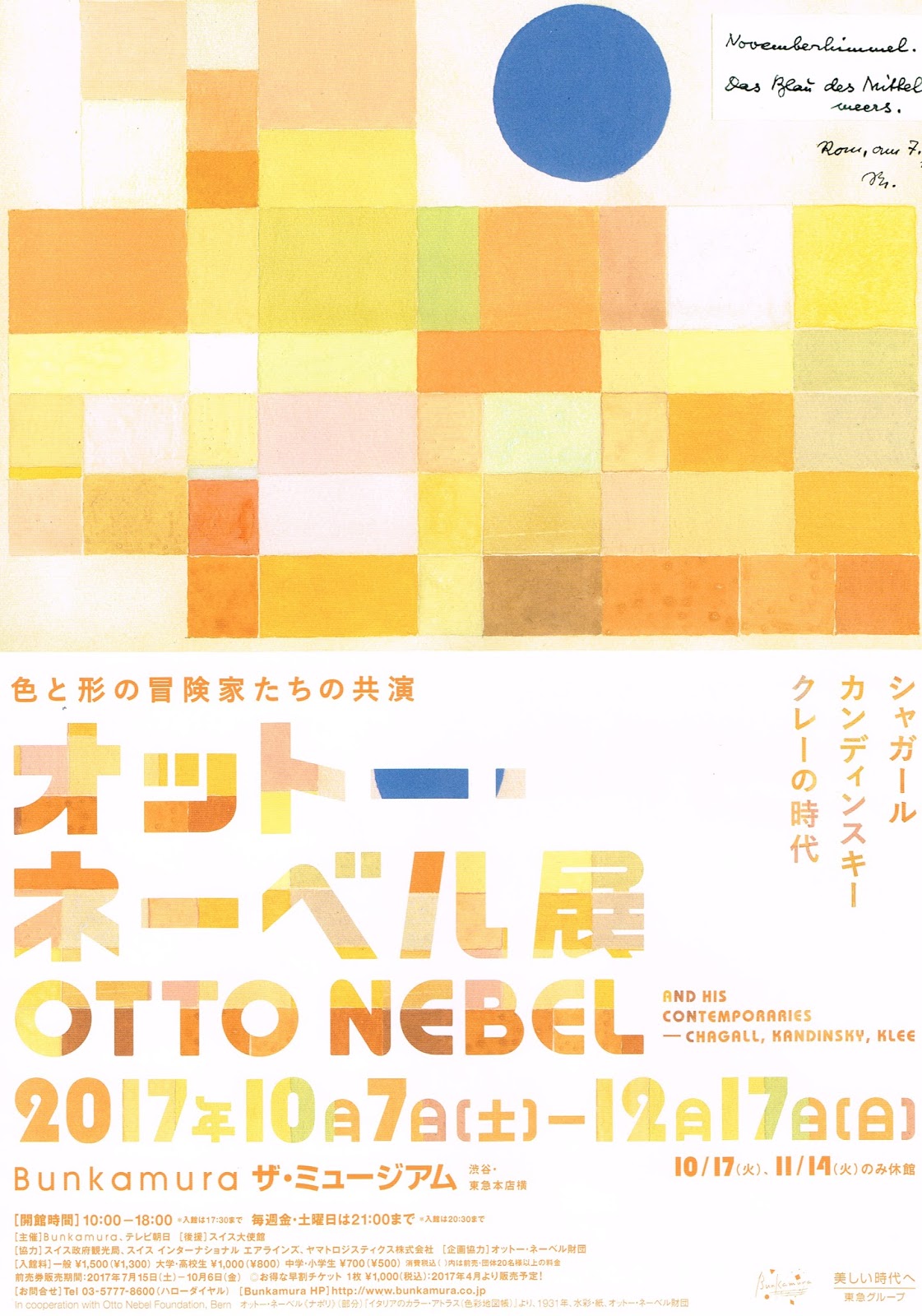 この画家の簡単な紹介とこの回顧展などついて主催者あいさつから引用します。“主にスイスで活躍したドイツ出身の画家オットー・ネーベル(1892年〜1973年)は、1920年半ばにワイマールに滞在し、バウハウスでワシリー・カンディンスキーやパウル・クレーと出会い、長きにわたる友情を育みました。特に、その後半生を過ごしたスイスのベルンでは、共にドイツから移住した晩年のクレーを支え、家族ぐるみの交流を持っています。ベルンのオットー・ネーベル財団の全面的な協力を得て開催される日本初の回顧展となる本展は、バウハウス開校100周年(2019年)を前に、若い日のバウハウス体験に始まり、素材やマティエールを追求し続けた画家ネーベルの知られざる画業を、風景を色彩で表現した『イタリアのカラーアトラス(色彩地図帳)』を始めとするスケッチブックとともに紹介します。さらには、建築、演劇、音楽、抽象、近東など彼が手がけたテーマに沿って、クレーやカンディンスキー、シャガールなど同時代の画家たちの作品も併せてご紹介することで、色と形の冒険家たちの一人として、ネーベルが様々な画風を実験的に取り入れながら独自の様式を確立していく過程に迫ります。”また、この回顧展に協力したというオットー・ネーベル財団からのメッセージではネーベルを次のように紹介しています。“1892年にベルリンで生まれたネーベルは、画家であると同時に詩人でもありました。彼は、言語と造形芸術が交わる領域での実験を可能にするふたつの天分を備えていたということになります。若い時分における建築技術者としての修業経験は彼の作品の多くに反映されており、われわれはネーベルにおける色彩と形の体系的な分析を、『イタリアのカラーアトラス(色彩地図帳)』や、記号とルーン文字を用いた抽象的な作品を通して知ることができるのです。”この紹介では、具体的なことが何も語られておらず、というよりは言えないといった方が適当かもしれません。この紹介でも名前が出てくるカンディンスキーやクレーのように美術ファンが見れば、ひと目でそれと識別できるような突出したものを具体的に指摘できるような画家ではないということです。その代わりに、かれらと親しく付き合ったという人柄とか、そういうものを紹介せざるを得ないというタイプ。芸術運動の中にいながら、スターの影に隠れて埋没している、人柄はよくて、それなりに運動を進める力はあるけれど、運動に貢献するところで、そこからの果実はスターに持っていかれてしまう、そういうタイプを紹介するさいには、このような紹介の仕方になってしまうのでしょう。この回顧展の主催者でも、シャガール、カンディンスキー、クレーといった人たちの作品をもってきて、ネーゲルとの付き合いとか時代の雰囲気といって並べて展示していたのは、ネーゲルの作品のみの展示では場が保たないと感じたからではないかと思います。私の言い方は意地悪でしょうが、実際の作品を見ていくうちに、そういうネーゲルの苦労と、結構いけるのではないかという発見もありました。実際、展示に見入って、予定していた時間に美術館を出ることができなくなって、集まりに遅刻してしまうことになってしまいました。それは、これから見ていきたいと思います。 プロローグ:オットー・ネーベル─「シュトゥルム」と「バウハウス」時代の芸術家 1.初期作品 Early