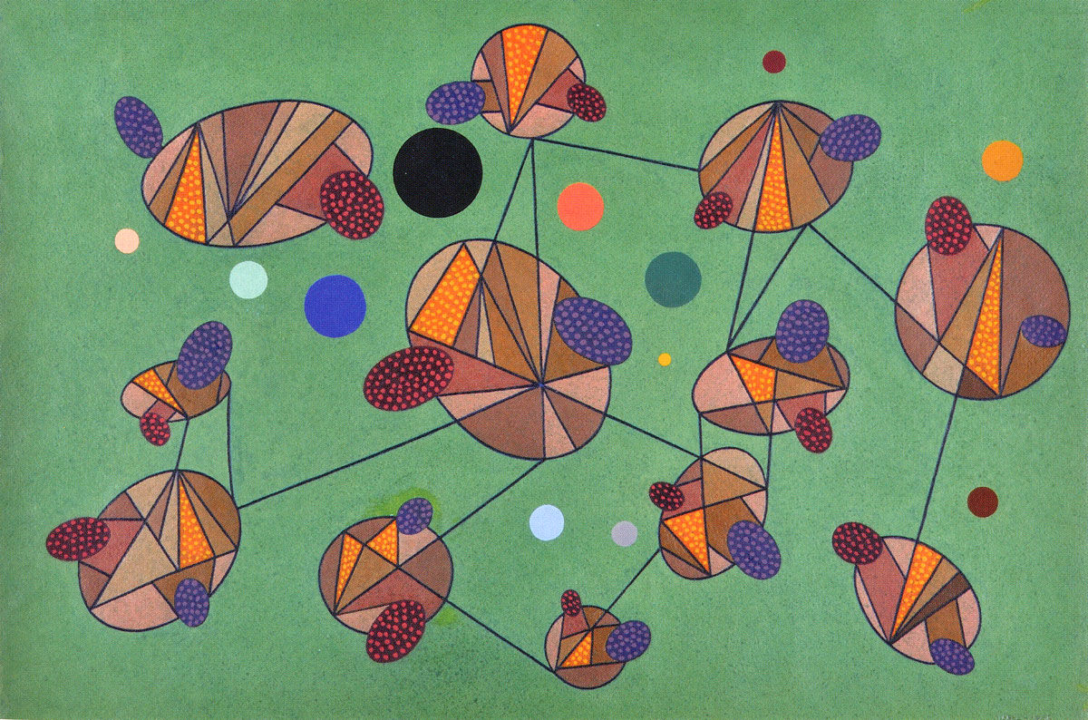 ネーベルはカンディンスキーのフォルムや色彩は自然の表象から導くのではなく、画家の内面から汲み取られるものなのであるという主張を、彼なりに進め、精神的な意味での内的な光を可視化することを目指したと言います。このプロセスで出会ったのが『易経』で、そこに記されている複数の線を組み合わせた卦(ヘキサグラム)から自分の制作への後押しを 「幸福感」(左図)という作品です。これは洗練が行き過ぎたかもしれませんが、今までの作品にはなかった穏やかさがあります。その代わりに、突っかかり所のあまりない作品になってしまっていますが、親しみ易いというか、ふつうの家庭の居間に飾ってもお洒落な感じで、ほとんどインテリアとして違和感のないものになっている作品であると思います。この中では、背景の黄色い地のところに、碁盤目のように秩序だった細かな点描というより絵の具を点状に盛り上げた集合が、グルーピングされて、そのグループが間をおいて並べられているところです。それが画面には、小さな影を作っている。その並びが秩序感をつくりだしたり、場合によっては波打つような動きを感じさせたりしています。ちなみに、このような手法を点描のヴェールと言うのだそうで、“画面全体に規則的に散った小さな点は、まるで画面に一部半透明なフォルムや印が浮かんでいるかのように印象を与える”ものだそうです。これが、画面中央の黄色が濃くなっている部分の点描状の模様のある図形のベースを重層的に支えているように見える。一見、穏やかで軽そうに見えて、しっかりした土 参考として展示されていたカンディンスキーの「緑色の結合」(右図)のようなベタ塗りの図形のような抽象的な作品の平面的なノッペリした感じとは異質の画面をつくっていることが、明らかに分かるようになってきたのが、ここに展示されていたネーベルの作品です。 8.ルーン文字の言葉と絵画 Runes in