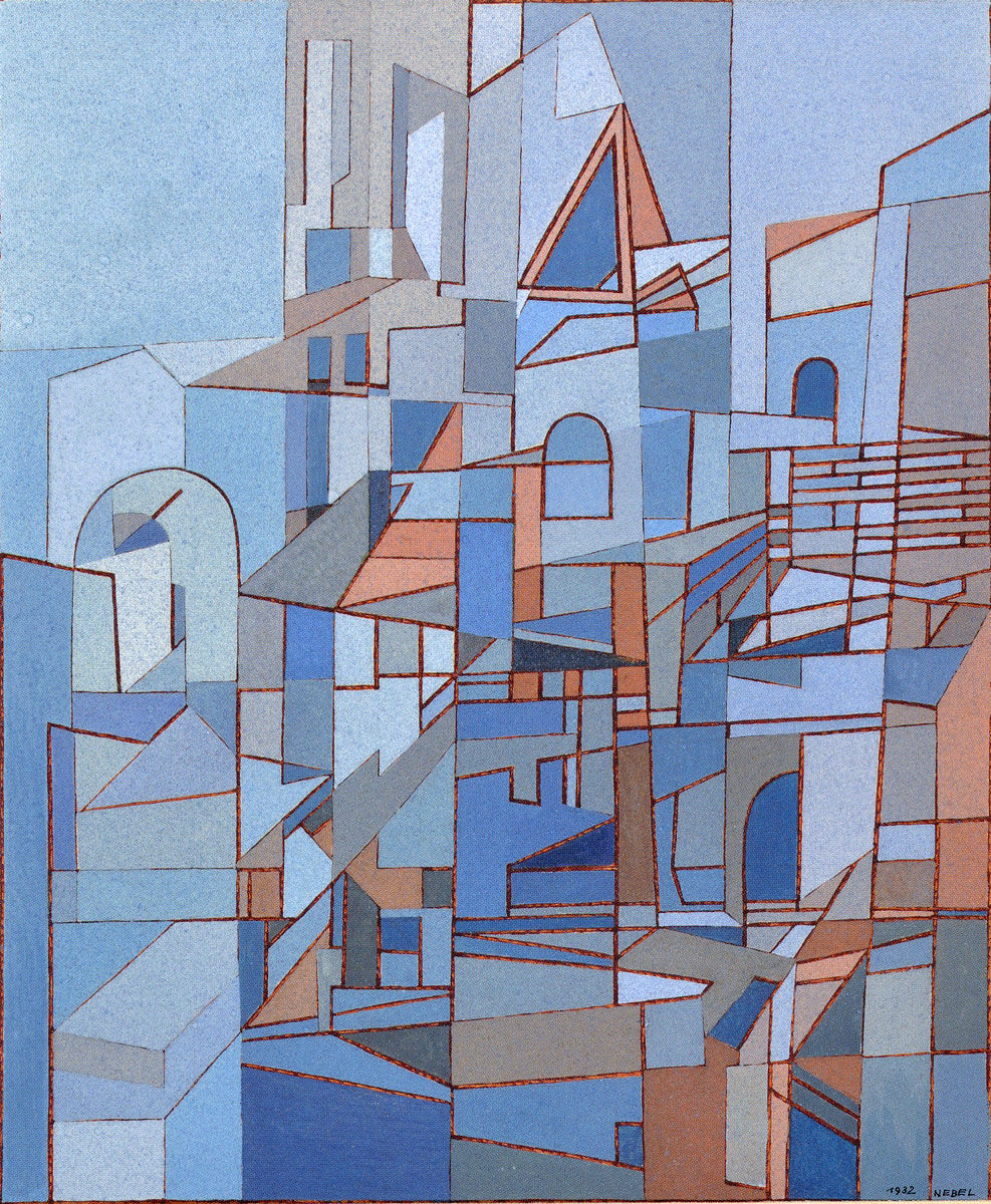 「トスカーナの町」(右図)は大聖堂の絵でいえば、「青い広間」に相当するように、「シエナV」が赤系統であるのに対して、青系統です。一見しての印象ですが、ブラックの分析的キュビスムの作品に似ているようにも見えます。 むしろ「地中海から(南国)」(左下図)という作品で、点描であることをあからさまにして提示したことの方が、私には、ネーベルが二重性格の隠された姿を垣間見せた、しかも分かり易い形で、という点で魅力的に映りました。全体の印象は淡い色調で、必ずしも南国風ではない。この作品では、点描という名目で、細かい作業の細かさを少し細かくしないで、その効果が普通にわかる様にしていて、カンディンスキーもクレーもシャガールもやろうとしないことをやっていることを明らかにしています。しかし、それゆえにネーベルの作品の中では微温的と映る。それは、私がネーベルの病的なところに捉われているからなのですが。