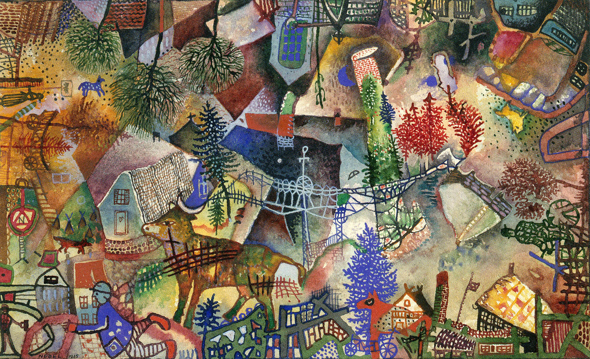 初期作品として展示されていたのは、主に1920年代の習作のような作品ということでしょうか。「山村」(左図)という作品。南ドイツ、バイエルンのコッヘルという山村に滞在していたときの作品ということです。水彩画ですが、水彩絵の具に特有の色の感じや、ぼかしやにじみなど効果のせいかもしれませんが、色彩のセンスは、ネーベルは天与の才能として持っていたのが分かります。原色に近い鮮やかな色を使いながら、決してどぎつくならない、色と色とが対立するような緊張関係を作らないで、見ている者には刺激的になっていません。また、画面に天地の関係が分からない空間になっていたり、人や動物が画面に浮かんでいるように見えたりする画面構成は、まるでシャガールのようで、画面中央にはシャガールを想わせるような緑色の牛(馬?)が背景とは不釣合いの大きさで描かれています。山荘風景というよりは、幻想といった方がいいかもしれません。同時に展示されていたシャガールの「私と村」(右上図)の左手に白く描かれている馬と「山村」の真ん中下の緑色の牛を比べて見ると、よく似ていると思います。また、パウル・クレーの「いにしえの庭に生い茂る」(右下図)の庭に繁る草を上からなのかもしれないが、どの視点でみているか分からないのに、どこか秩序があるように落ち着いているのに、発想が似ているようにも見えます。