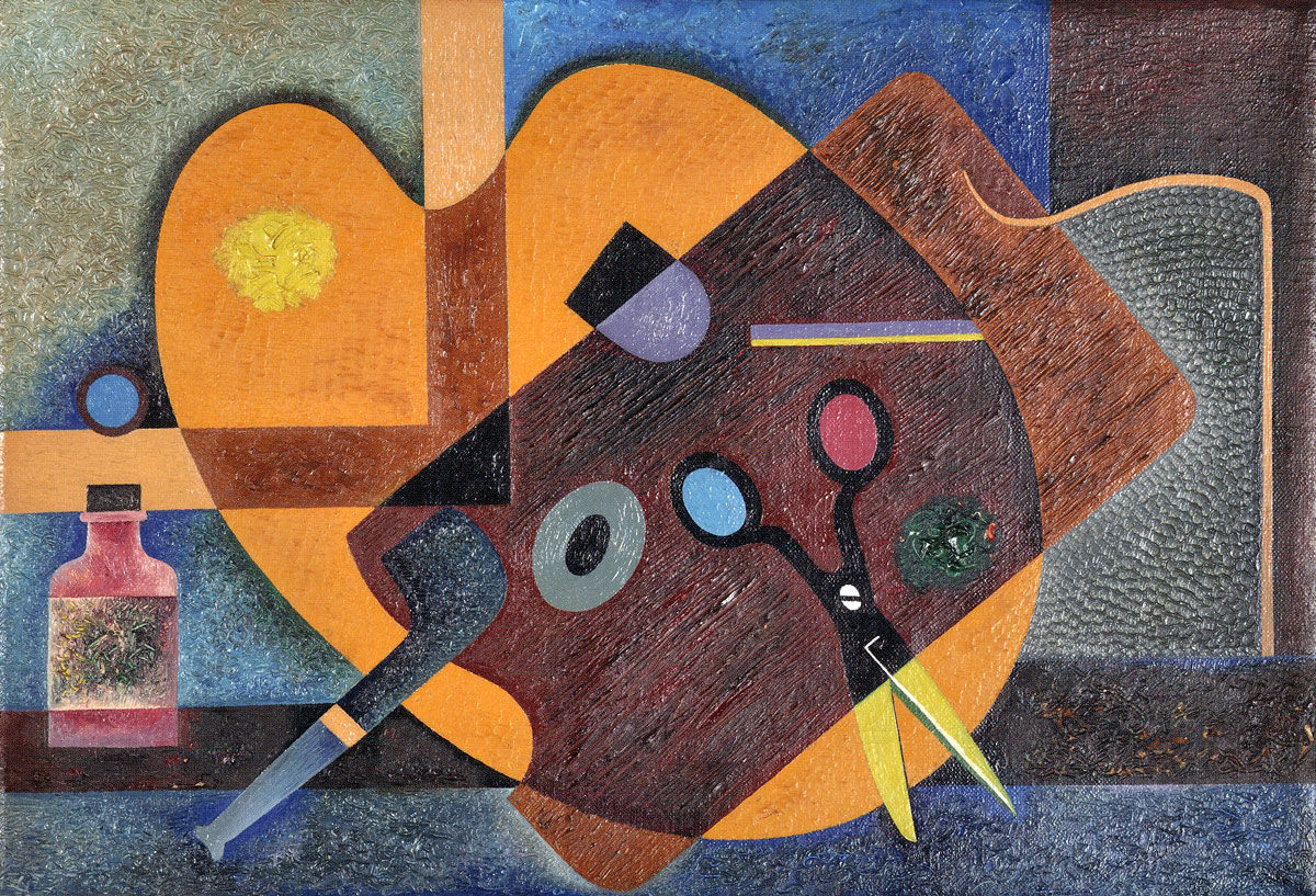 「二枚のパレット」(右図)という作品です。私は、この作品にネーベルらしさが生まれてきたというように感じました。パレットや画材を類型化し図案化したような作品です。他の画家たちが物体の外形を写すことから自分が認識するという方向で事物の外形から脱皮していこうとして