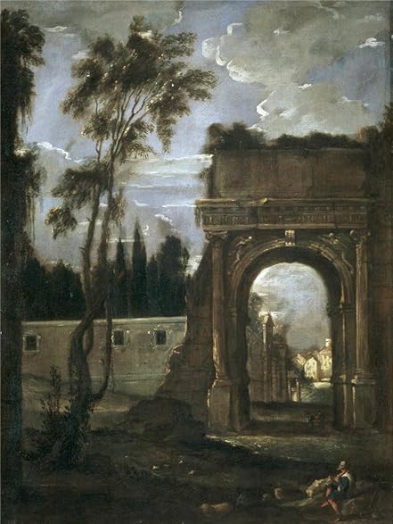 物は風景の一部となって、画面を構成するパーツです。解説にあるように画面全体の構成が構想されて、その設計にしたがって、パーツが丁寧に描かれて、全体としてのひとつの世界を構成しています。展示されている他の作品に比べて、異質に感じられるほど落ち着いて静かな感じのする作品でした。それだけに会場の中でも地味で目立たない印象で、会場でも下手をすれば素通りされてしまうという、かわいそうな位置にあったと思います。決してそういう作品ではないのですが。似た構図で並んで展示されていたファン・バウティスタ・マルティネス・デル・マーソの「ローマのティトゥス帝の凱旋門」(左下図)が明らかに、この作品を参考にしているようなのにロマン主義的な廃墟の感じとか、粗い筆致で動きを画面に与えていたりして、見る者に感情的な雰囲気を想像させるようになっているので、比較的目立ってしまっています。