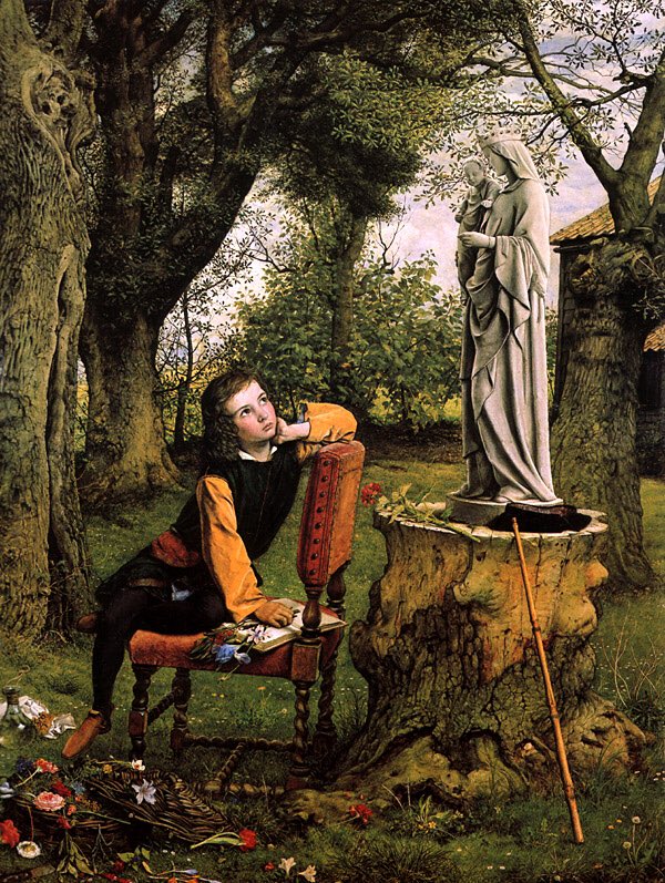 向かっていた。その道中、自分の兄弟を殺した男と出会った。彼は復讐としてその男を殺そうとした。男は、武器を十字架の形に広げてひざまずき、その日に磔刑に処せられたキリストの御名において慈悲を請うた。ジョヴァンニは男を許した。ジョヴァンニはその後、立ち寄った教会で祈りの最中に、木造のキリスト像が手を差し伸べられ祝福を受ける。キリストのひげは、騎士の額と言い表せない悲しみの表情の盾となっている。キリストの手の聖痕は、騎士のむきだしの手の弱々しさを引き立たせている。また、平面的な画面全体を覆うグリーンの美しさに目を奪われますが、陰影の処理や人体の立体感などにラファエル前派にはない独自性が芽生え、甲冑の光沢感、周囲の幻想的なまでの草花など、後のバーン=ジョーンズの作品を彩る要素がすでに表われています。