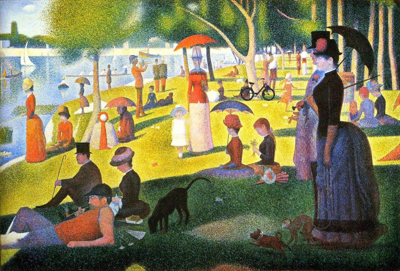 ます。印象派は、光を表現しようとしたといいます。その印象派の特徴的な技法として色彩分割というものがあります。普段私たちは何気なく自然光の中でものを見ていますが、その光は単一ではなく、様々な波長の光に分割できるのです。とくに可視光線は分かり易くすれば三原色に分割できます。プリズムに光を通すとそれが現われます。それは、青・赤・緑の三色。 それに比して色(絵の具)の三原色は、青・赤・黄となります。カクテル光線と言われるように、光は三原色が混ざれば白く輝きますが、絵の具は三原色が混ざればグレーに濁って、暗い色になってしまいます。光は混ぜれば混ぜるほど明るく輝きますが、絵の具は暗く沈んでしまうのです。西洋では特にルネサンス以来、空間表現のために遠近法を駆使したり、さまざまな絵の具を考案したりと、技術的な追求には余念がなかったわけです。しかし、この光と絵の具の三原色の特質に違いは如何ともしがたく、現在に至るも未解決のままなのです。色彩分割とは、絵の具を混ぜて中間色を作ろうとするとどうしても濁ってしまうので、絵の具を混ぜずに澄んだ色のままキャンバスに乗せ、隣接する部分に本来混ぜようとする色を乗せ・・・とすることで、あくまでも塗る色自体は澄んだ色・・・ 一筆ごとに澄んだ色を乗せることで、画面全体としては明るく澄んだ色の集合体とするのです。そうしてそこから発せられる光を観る者の目が捉えるときに、観る者の目の中で混ぜて、本来画家が表現したいと考えた色に合成して観てもらおうというものです。(だから印象派の絵は、数メートル、時には10メートル以上離れて観ると、実に深い味わいになります)その原理そのものは印象派を待たずともすでに確立されていたのですが、しかしながらそうした描法は、光から影への、色から色への、滑らかな移行という課題には適せず、絵がはっきりした一筆々々の集合体であることが強調されてしまう・・・そうした欠点を嫌われて、一般的には採用されなかったものだったのです。だから、印象派の画面を見ると原色の絵の具が盛り上げられて置かれたようになっているように見えるところがあります。近寄ってみると粗い感じがしますが、色彩分割の効果を考えて、絵の具の盛り上げ方によって光のニュアンスが変わってくるからなのです。しかし、それではどうしても全体として粗いものとなって大雑把になりがちです。それをもっと細かいところまで表現できるように突き詰めたのが点描(例えばスーラ「グランド・ジャット島の日曜日の午後」(左側))なのです。分割した光の粒子を点にすることによって粗かった光の表現を細かいものにしていきました。ということは、この点描の点を細かくしていけば、それに従って光の微妙な表現が可能になってくるというのが理屈です。しかし、それには画家の労力は大変なものになっていきます。一筆で塗れてしまうところを数十、数百、数千の点をしかも色を変えながら点描するわけですから、労力は数十倍、数百倍、数千倍になるわけです。だから、印象派から、その発展系といえる新印象派の画家たちでも点描を積極的にやったのはスーラくらいではなかったでしょうか。それを高島は、部分的に、あるいはこの「積る」では、ほぼ全面的に点描を行なったといえるのです。そこには、印象派のような絵の具の混濁を避けるということよりも、光をも分解してしまうというような、高島のもともともっていた視線、あるいは細かいところを執拗に描いてしまう志向性が光を粒子に分解してしまうことに行き着いたのではないかと思えるのです。そういうことを考えると、この「積る」という作品は、高島の志向性が凝縮していると、私には思えてくるのです。本当に、この白は凄いです。