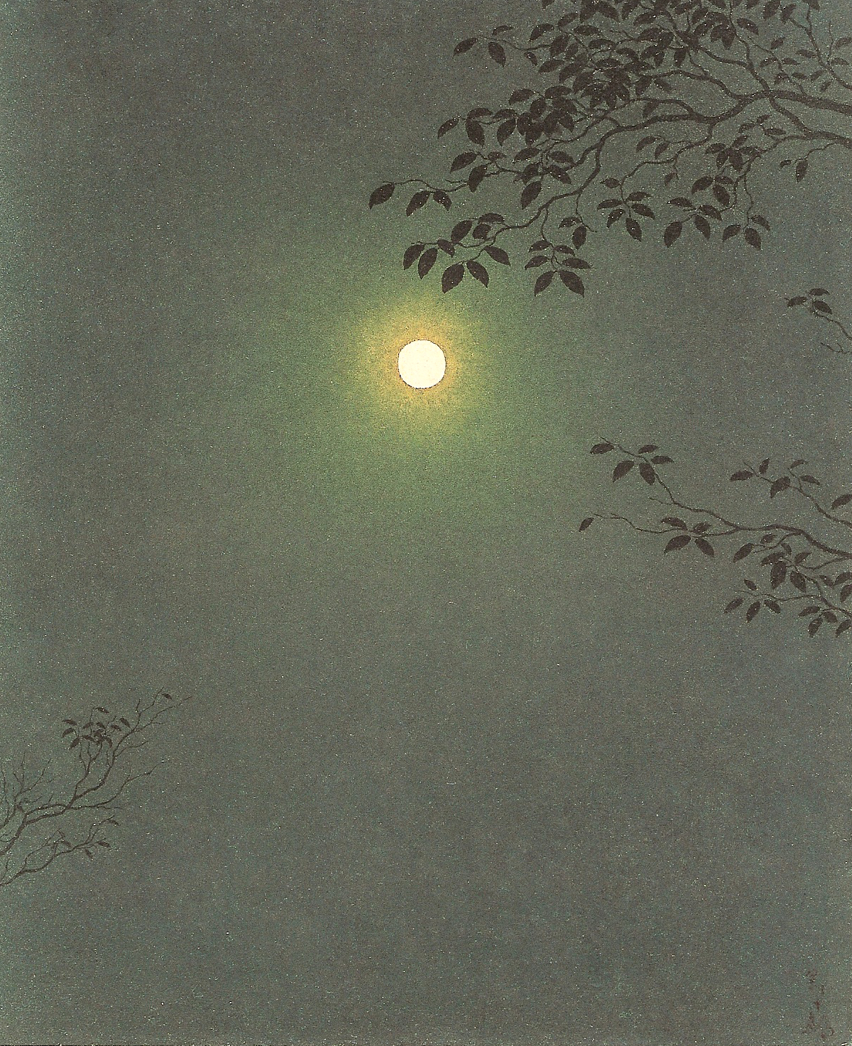 「満月」という1963年の作品。高野は同じタイトルの作品を何点も描いているようですが、これはその中の一点です。夜空に満月が浮かんでいるという非常にシンプルなものですが、満月の光が夜空の波及するようにひろがっていくさまは、とくに月のまわりの光の反映するさまなどは非常に細かく、それこそ光の粒子を一粒ずつ描くように描いています。おそらく昼の太陽を描いても光が強すぎて、光が徐々にひろがり、それとともに徐々に弱まっていく段階のようなものは描くことができないでしょう。夜の暗い影が基調となっていることで、コントラストをつけ易いという都合のよさがあったと思います。それでは、もっと月を大きくえがいて、光と影のコントラストを大きな月をベースにもっと精緻に描くこともできたであろうに、高野はそうしていません。むしろ、影となった木の葉を挿入して月の光と影の描写を邪魔するようなことを敢えて行なっています。たぶん、この作品の構図とか構成は日本画でよくとられる月を題材としたものでは一般的といえるものです。それが、高野のこの作品では違和感を覚えるのです。