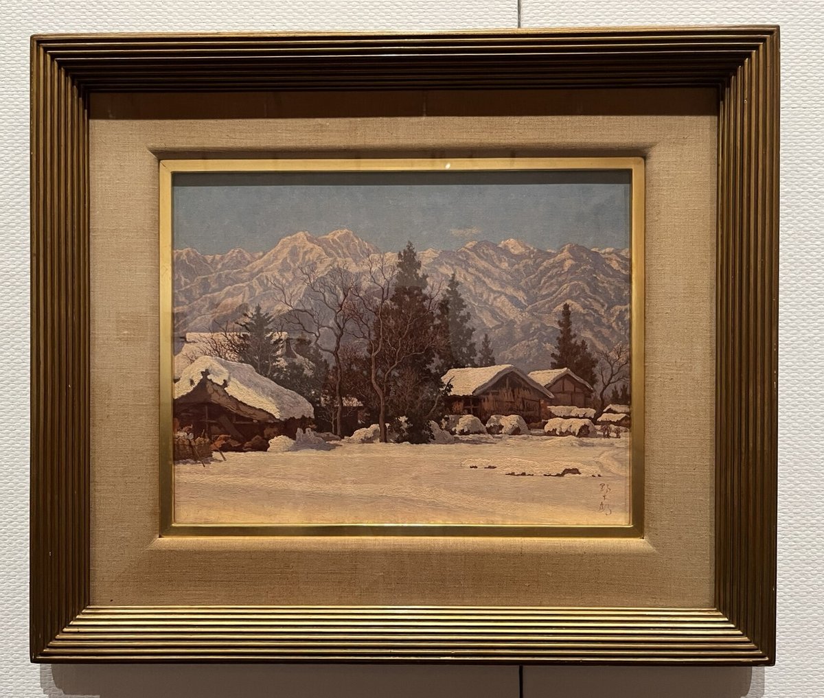 “どこにでもあるような平凡な風景。それだけに朝霧で濡れた枯草の湿った状態や霧に隠れる木立の様子、そして湿気をたっぷり含んだ冷気の感覚がストレートに感じられる。枯草や黒土が細かく描写されているので、朝の山の空気や雰囲気が立ち上ってくる。形として現われてこないものを表現しようとしている。”と説明されていました。これも、空気とか雰囲気とか、どこにでもあるような平凡な風景。それだけに朝霧で濡れた枯草の湿った状態や霧に隠れる木立の様子、そして湿気をたっぷり含んだ冷気の感覚がストレートに感じられる。枯草や黒土が細かく描写されているので、朝の山の空気や雰囲気が立ち上ってくる。形として現われてこないものを表現しようとしている。「春雨」と同じように、見えないものを描こうとしている作品です。