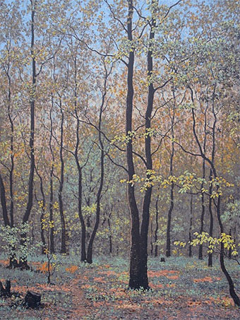 「萌え出づる森」(左側)は1963年の作品。早春の森の風景を若葉の一枚一枚、下草のひとつひとつまで点描のように細密に描き込まれた作品です。その一つ一つが明確な輪郭で細かく描き込まれているので、かえって全体が平面的に映ってしまっています。そして、現実の森というのは、これほどまでにスッキリしていないで、もっと雑然としているものだろうと思います。この作品の画面の森の木々はきれいに上に伸びていて、折れていたり、節になっていたりというのは見られません。つまり、描かれているものは整理された風景、つまりは絵画として映えるように整理されている。これらのようなことから、この作品の風景には実在感というのが稀薄で、どこか浮いたような、非現実的な感じがします。ルネ・マグリットの「白紙委任状」(右側)で描かれた森のギミックな感じに印象が近いものとなっていると思います。