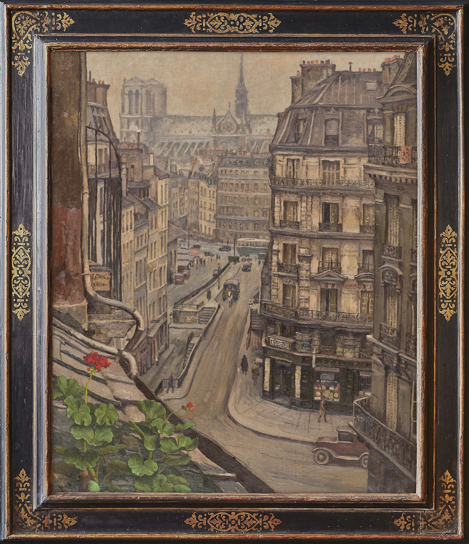 「ノートルダムとモンターニュ通り」は1932年、高島42歳の時の作品です。多くの日本人画家は20代の若いうちに留学して、多大な影響を受けるのでしょうが、高島の場合のような40代では固まってしまっているのではないか。それほど画風の目だった変化は見られません。このころのパリには、20世紀絵画の代表的な画家が集まっていて、最先端の芸術がひしめいていたと思われるのに、です。この作品では、パリの都市の建築物がきっちりと描かれていて、画面の左下にゼラニウムの赤い花が建築の直線的な描写と対照的に、ゴッホ的なうねうねした線で生命感が溢れるような描き方がされて、そこが印象的でした。