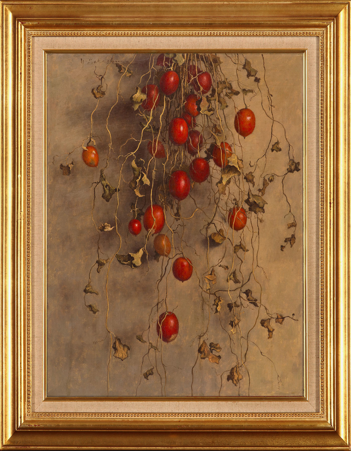 「からすうり」は1933年の作品で、高島は植物を描いた静物画を多く描いていて、そのうちの一枚です。また「からすうり」は何点かあり、これは、そのうちの一点です。高島は大学農学部で研究者として過ごしたわけですが、当時の理科系の研究者は観察の記録を残すためにスケッチの技術が求められていたはずです。今みたいにカメラが一般的で性能が高くなかったので、実験や観察したもの、例えば顕微鏡で見たものを、写真に代わって精確な記録にのこすためにスケッチをしていたはずで、高島の写実的な画風の基礎はそういうところにあったのではないかと、個人的に想像します。それだから、形を精確にはっきり分かるように書く必要がありますが、高島が植物を描く際に、茎などの輪郭の線が目立つほどくっきりと描いているのは、そういう事情が原因しているのではないか。しかも、標本のように形態を揃える操作が為されているように見えます。この作品では、中心線を決めて、画面の上部から紡錘型に枝がひろがるように垂れ下がる構図で安定感を作り出しています。