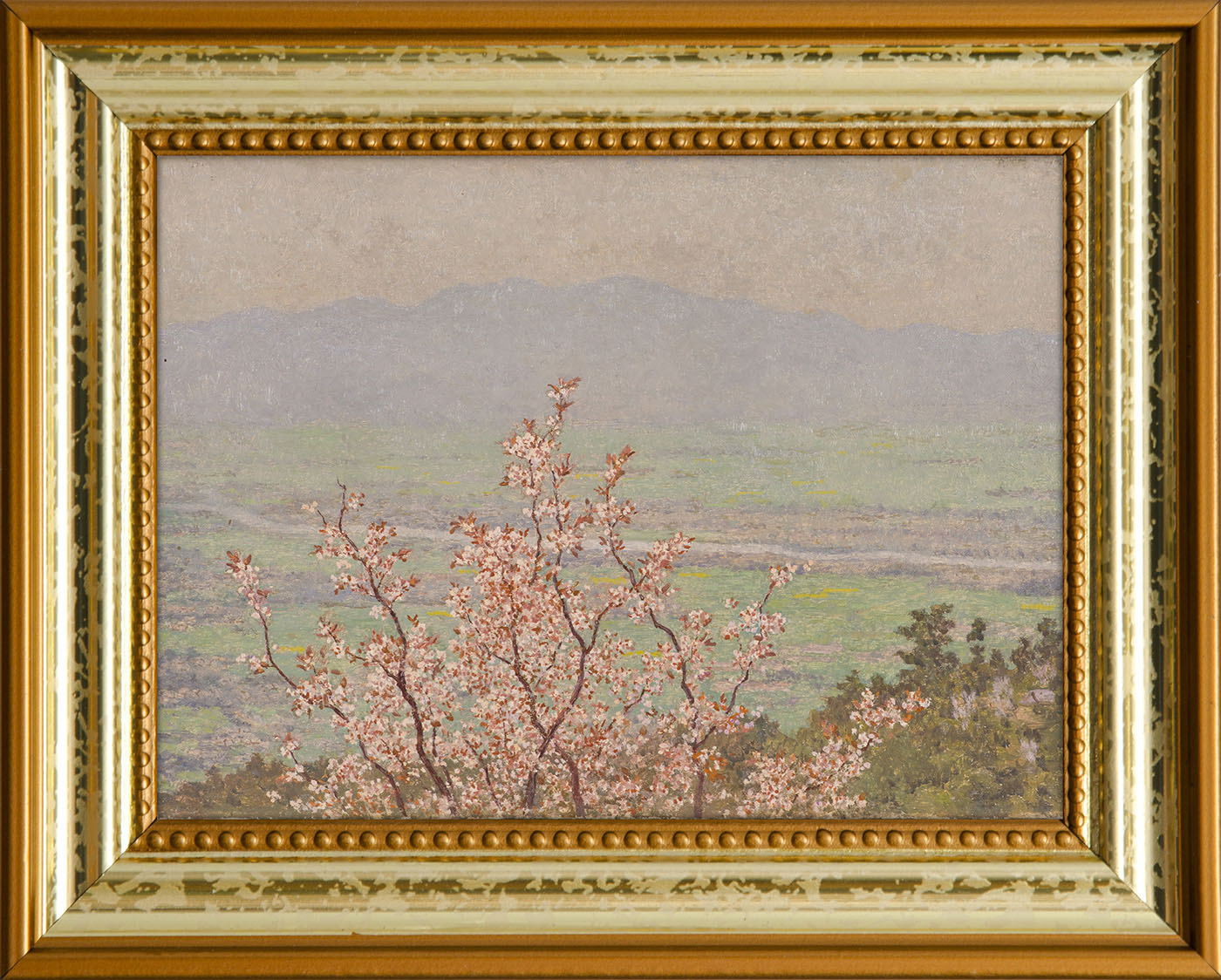 「筑後川遠望」という1949年の作品です。春霞がたなびいてぼんやりかすんでいる山並みをバックに、中景の悠々と流れる筑後川をはさんで、満開の桜の枝が浮かび上がる作品です。点描的な細かさは、この作品では満開の桜の花です。粒子のような桜の花のピンクが強い印象となって、目に飛び込んできます。ここでは、アングルは素人の写真愛好家が好むような月並みなものですが、この一部が暴走するような一点豪華主義の突出があります。福岡県出身の高島にとって故郷の風景であるわけですが、ここには、故郷への愛情のような思い入れはなく、旅人のような第三者が冷静というか、冷たい視線があります。それは絵葉書的なところがそうで、高島の個人的な視線が入り込むということは見られません。