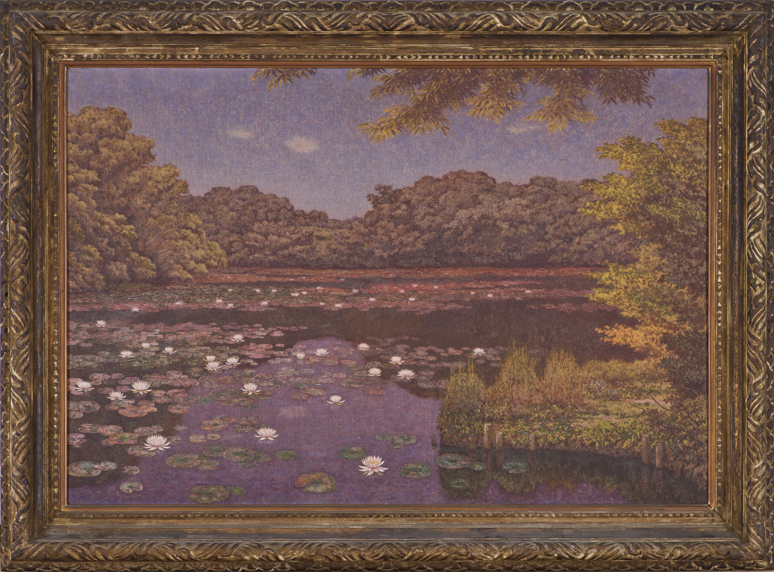 されたのではないかと思えるのです。これは、私の妄想かもしれませんが、ここで展示されている高島の風景画を見ていると、題材とか、その題材の取り上げ方ということにはユニークさがなくて、むしろ凡庸ですらあるのです。端的に言えば、高島の風景画は絵葉書的なのです。しかし、高島の真骨頂はそこから先にあります。この「すいれんの池」では、コピー・アンド・ペーストされたような白い睡蓮の花のレイアウトで、その白をアクセントにした、一見地味な風景の中で様々な色彩が万華鏡のように点描の細かなボットで交錯しあう複雑さにあります。それは、変な比喩かもしれませんが、琳派の大胆なデザイン的な屏風を顕微鏡で描きなおしたようなものです。この作品から16年後の1965年の「睡蓮」という作品では、1949年の点描のような細部の描写が多少過剰とも言えるほどだったのに対して、日本画のようにスッキリとした画面で、生命感に溢れるというより静謐な感じがします。細密な描写は相変わらずですが、描写は整えられていて、数個描かれている睡蓮の花は植物図鑑の図のような正確に整えられています。そういう睡蓮の花が秩序だっているのは仏画のように見えてきます。