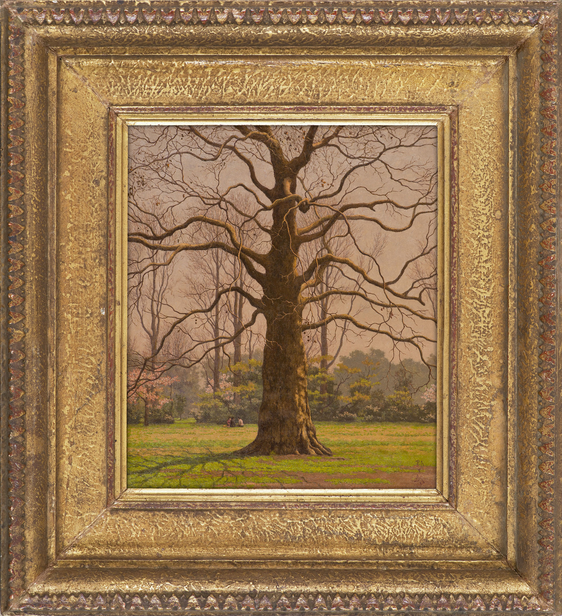 向き合うシンボルと言えます。これに対して高島の「御苑の春」のモミジバスズカケノキの大樹は、背景に若木の林が控えるように茂っています。高島の「御苑の春」のモミジバスズカケノキの大樹は、フリードリヒのオークの老木と同じように風雨に耐えながら長年生きてきた存在ですが、背景の若木は移ろいゆくものというのではなく、これから風雪に耐えて大樹となっていく可能性の存在です。そこで強調されるのは大樹の孤高さではなく、長年の風雪に耐えながらも枝を繁茂させる生命力であり、自然の大きさ、そして、若木が背景に控える自然の大きさであり、若木と対比される時間が込められているというものです。それらは、さらに大樹の根元の奥には3人の人の姿が小さく描かれていて、自然の大きさと人の小ささが対比的に描かれています。フリードリヒにはなかった人の姿があるわけです。それゆえというわけではありませんが、高島には、フリードリヒのような超越的な見えないものを画面に中に描く志向はなかったのだろうと思います。