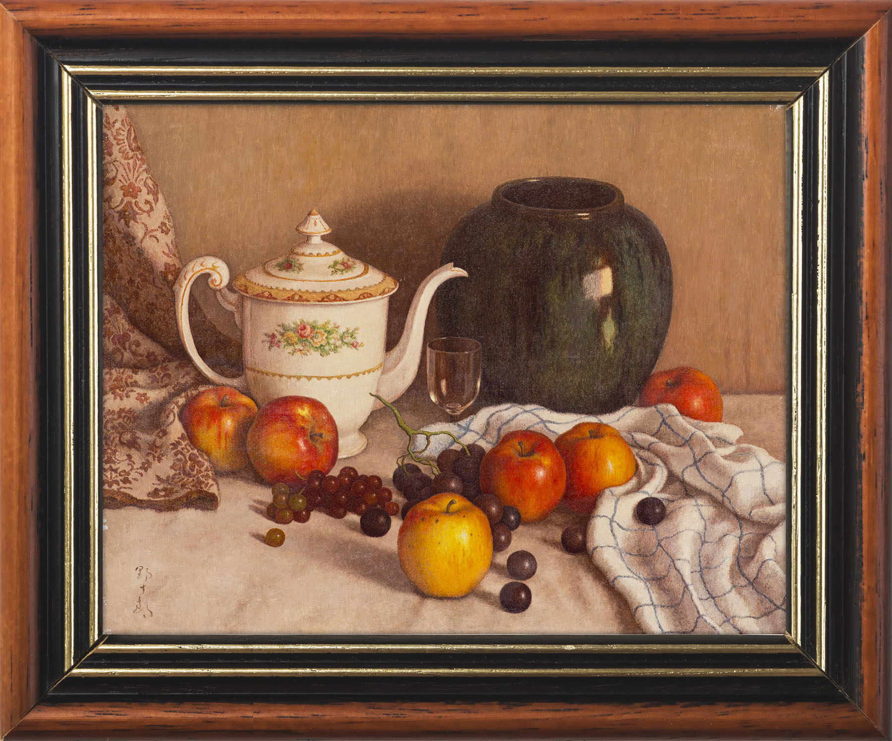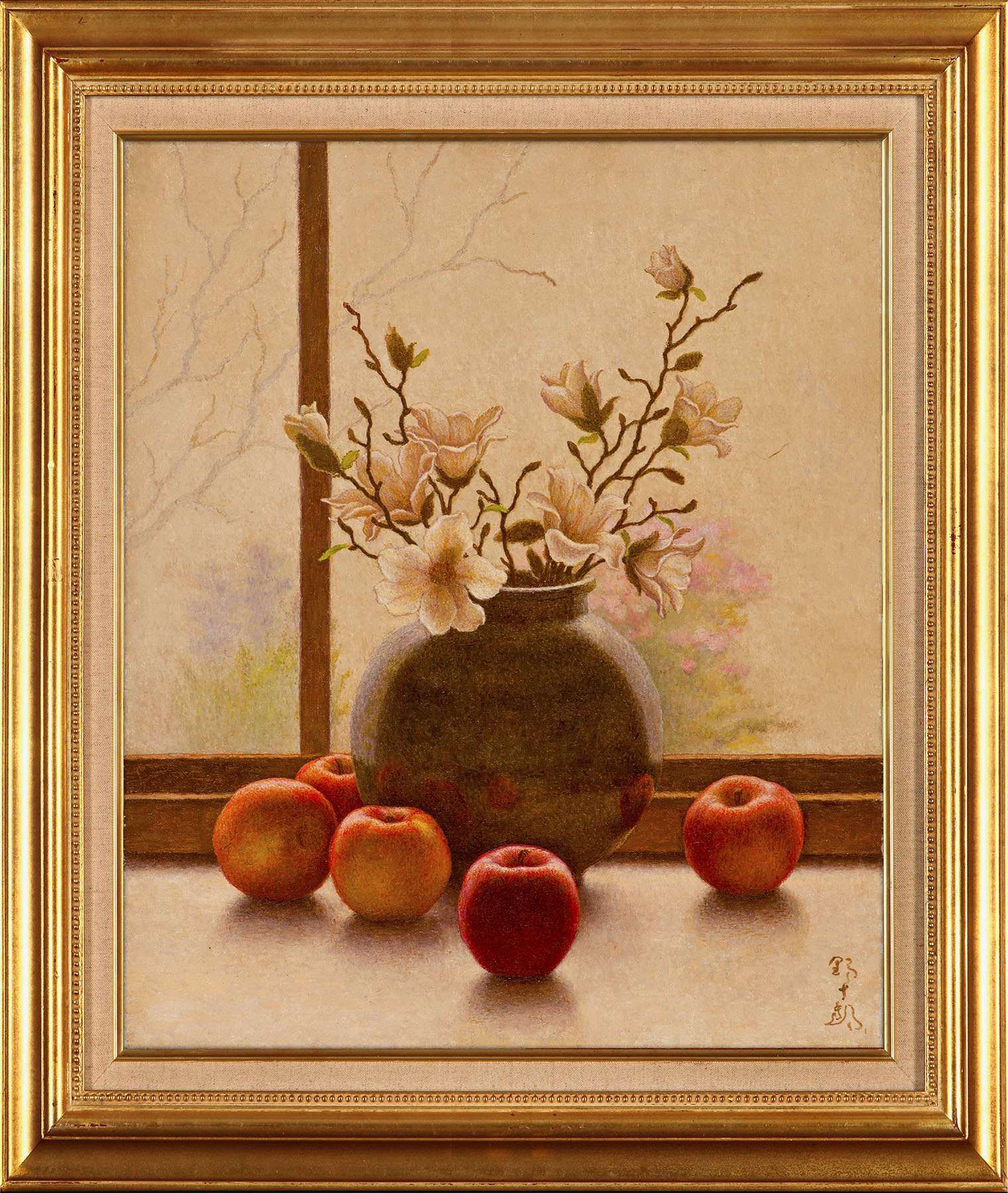 「ティーポットのある静物」(右側)は1948年頃の作品で、高島の静物画は食器や果物の配置を慎重に考えて配置による画面が構成されています。そこには、写実といっても、自然のありのまま、カオスよりコスモスとして捉えようとする高島の志向が根本にあると思います。この作品でも、一見バラバラに見えて、リンゴはV字に並べられ、Vの要となる中央のリンゴとグラスを画面の中心線上に配置して安定させています。そして、格子柄のクロースと豊かな模様のドレープが左右に、釉薬が光沢を放つ花瓶と白い磁器のポットの真ん中に透明なガラスという、シンメトリー的に対比をつくる構成になっています。安定した秩序を作り出していると思います。そして、1966年の「こぶしとリンゴ」(左側)は、「ティーポットのある静物」が画面の手前からの強い光でものの質感や実在感を描こうとしているのに対して、この作品では穏やかな光の演出が施されています。すりガラス越しにやわらかな逆光が差し込み、たおやかなこぶしの花が活けられている壺の側面にはリンゴが反射して映り込み、その背景には屋外の花木が透けて見えています。淡い桃色が多用された画面は、全体的に柔らかく穏やかな雰囲気となっていますが、黒い壺とリンゴの赤が画面を引き締めています。