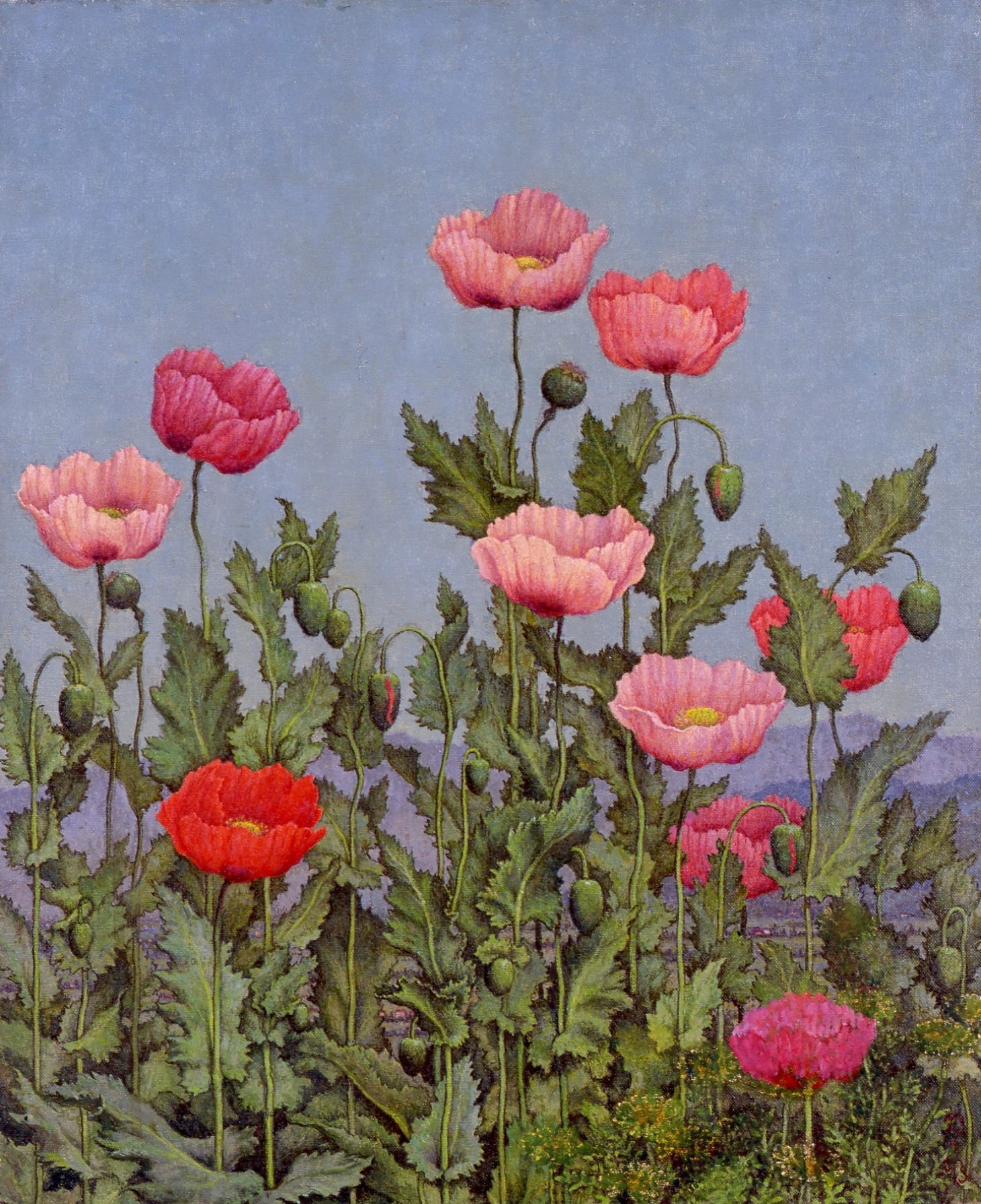 「睡蓮」と並んで展示されていたのが1967年の「けし」という作品です。静謐で天上の景色のような「睡蓮」とは対照的で、何本ものけしの花が整列して並んでいます。花を支えるすべての細い茎に輪郭線がはっきりと施されているため、茎の縦方向が強調され。まるでけしの花が上へ伸び上がろうとしているかのような不思議な印象を与えます。はっきりとした輪郭線が茎や葉のすべてに施され、まるで線描のような画面は、平面的にみえて(実はけしの茎と茎の間から奥方の山村の風景がうかがえて、奥行きがある)、画面を線で覆い尽くすくらいの印象は、ちょっと作風が違うのですが、アンリ・ルソーの熱帯風の繁茂するジャングルを描いた画面を彷彿とさせます。