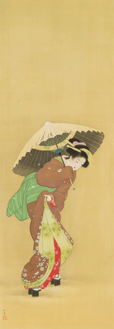 「初雪」という作品。“かじかんだ右手を袖の中に入れ、蛇の目傘を白く覆う雪の重みを感じながら支えている女性。左手では着物の褄をとり、転ばないように恐る恐る、高下駄を踏みしめつつ歩みを進めています。「いやぁ怖いわぁ」とでも言い